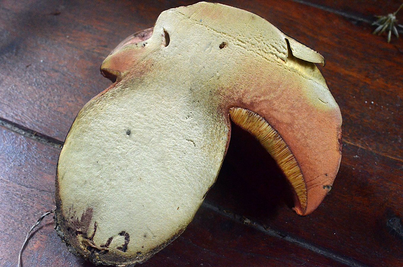 Die rote Linie über den Röhren im Anschnitt (d.h. der (orange)rote Röhrenboden) ist eines der wichtigsten Erkennungsmerkmale von Suillellus luridus. Sie unterscheidet ihn zuverlässig von S. queletii (Röhrenboden gelb), aber leider nicht ganz so zuverlässig von S. mendax.