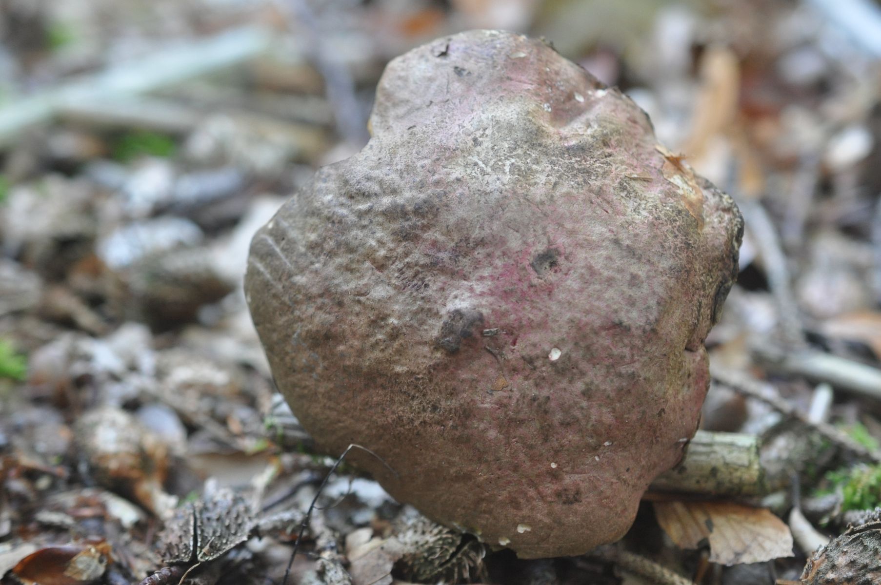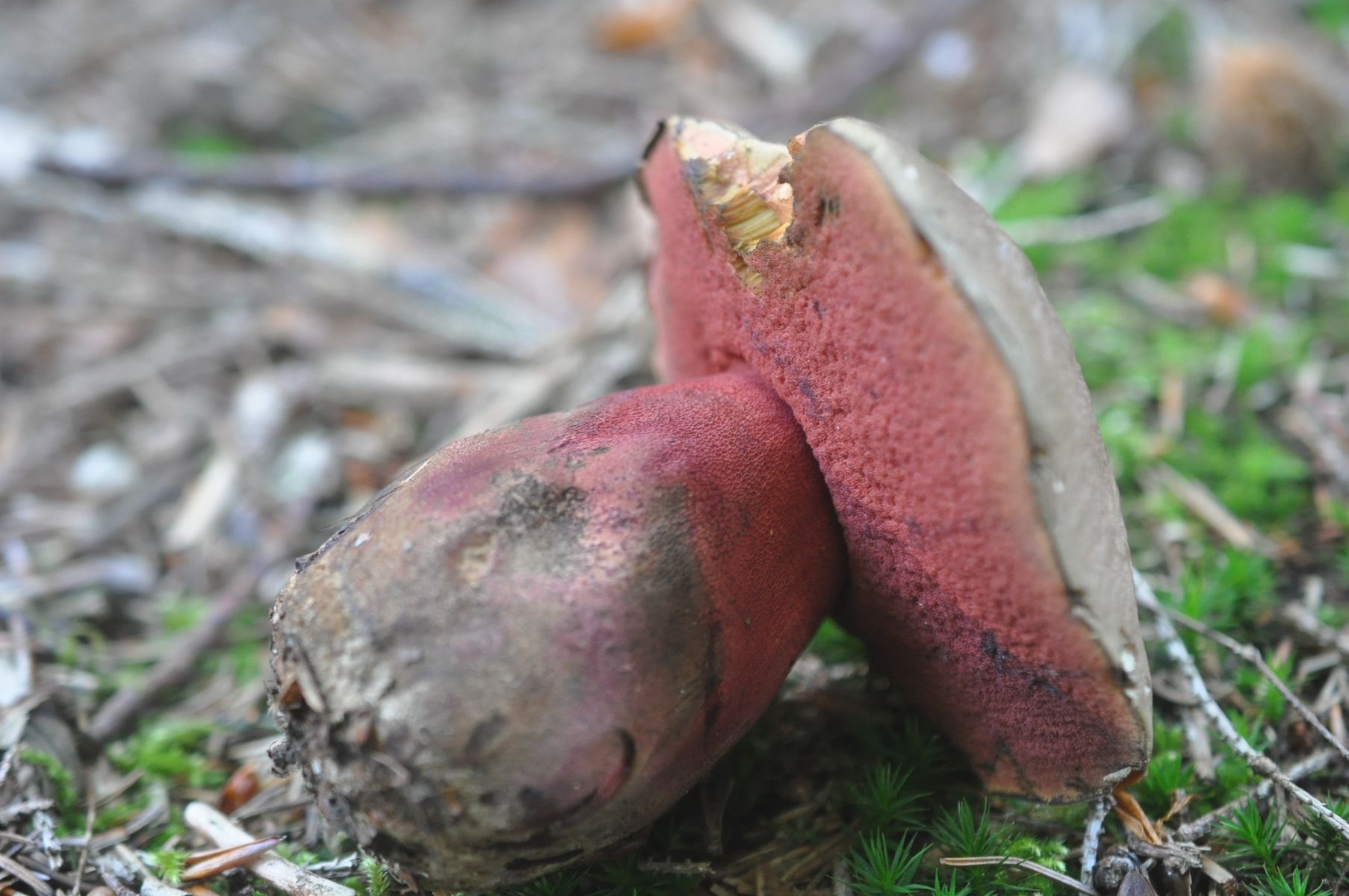 Hier noch zwei Fotos von meiner anderen Kamera. Ausschlag gebend für meine Zweifel waren in erster Linie die rötlichen Hutfarben und dann die rasche und recht intensive Blauverfärbung, insbesondere an den roten Röhrenmündungen. Auch wenn mir in der Gattung Rubroboletus die Felderfahrung fehlt, so wiederspricht das doch so ziemlich allem, was ich zu R. satanas gelesen und gehört habe. Ich bin der Meinung, dass das zu R. satanas nicht passt: