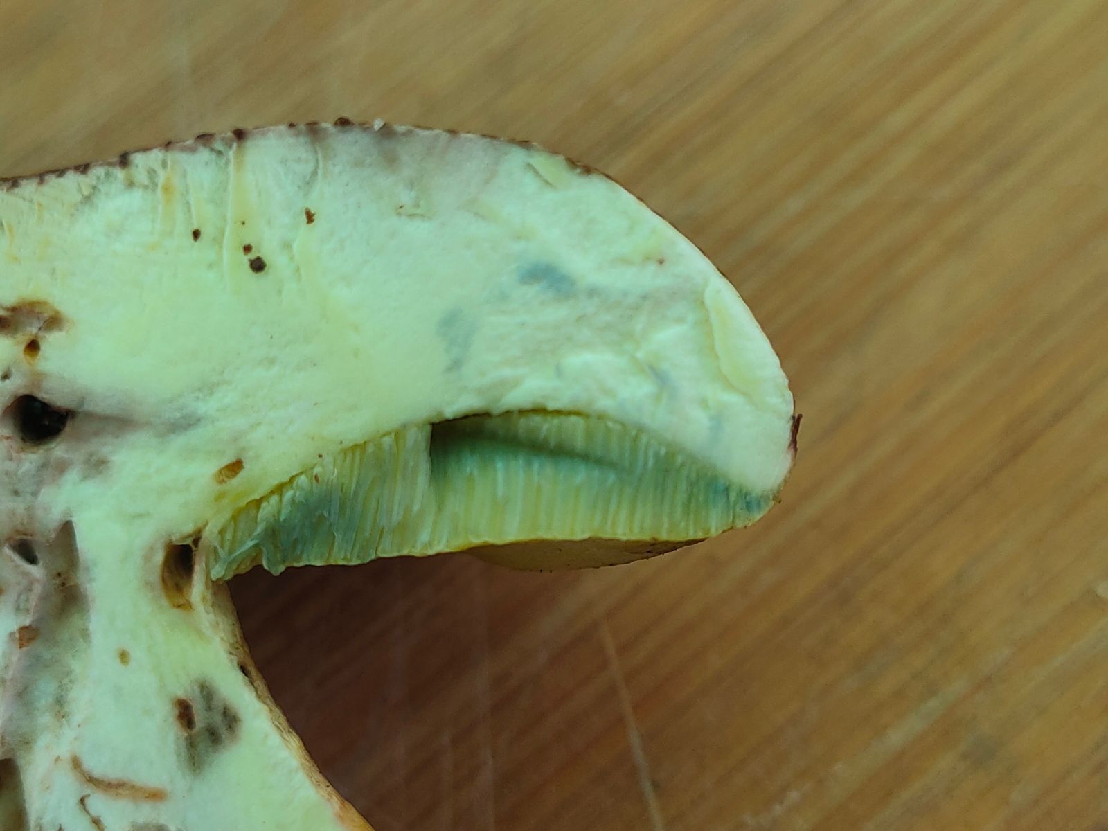 Das Schnittbild zeigt sofort ein citronengelbe Verfärbung, die im etwas Hut deutlicher ausfällt, als im Stiel.