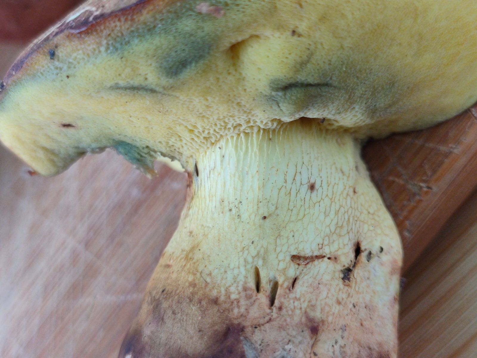 Der Stiel ist gelb und hat eine hellgelbe Netzstruktur, die nicht bei Berührung blaut