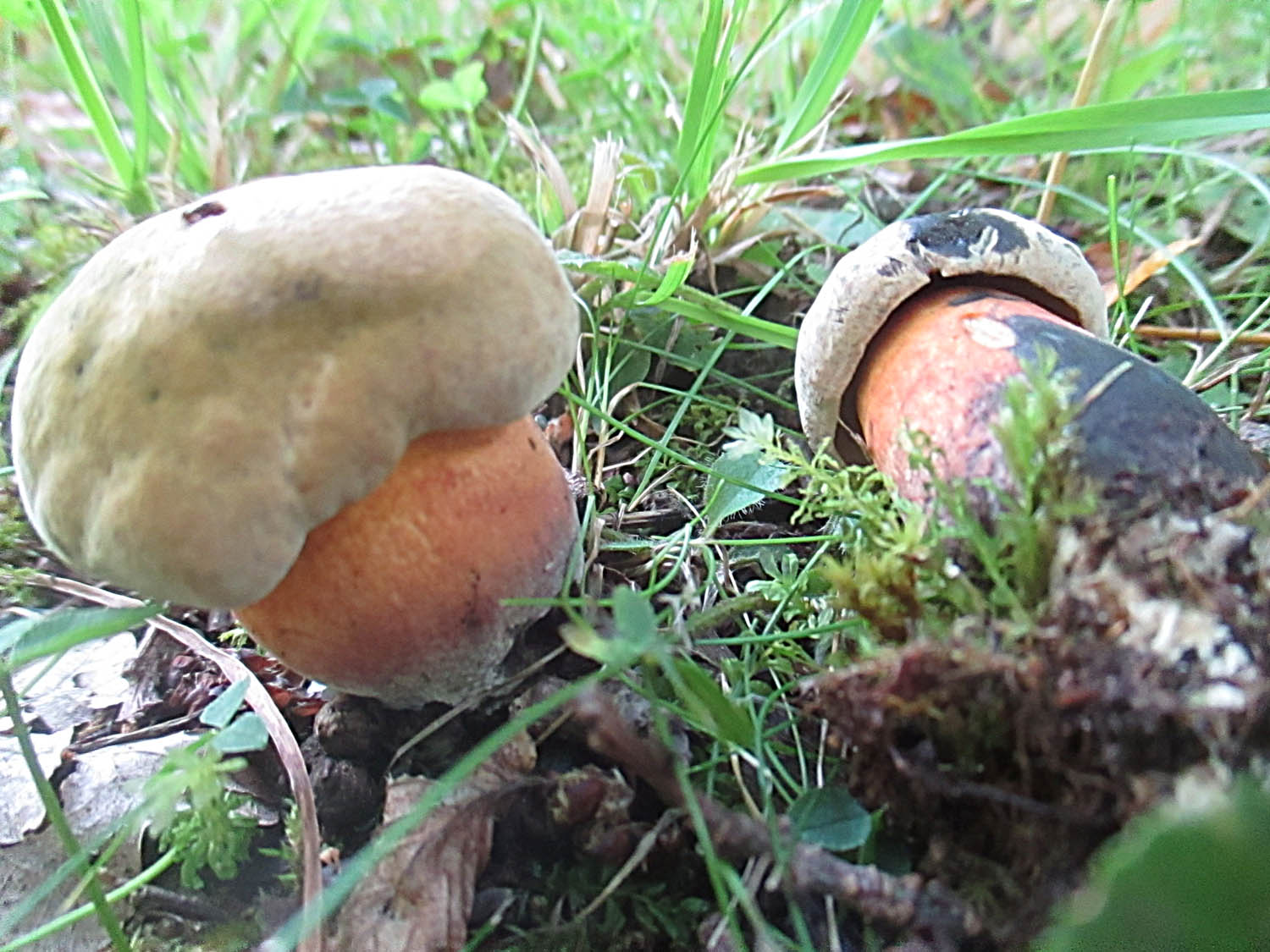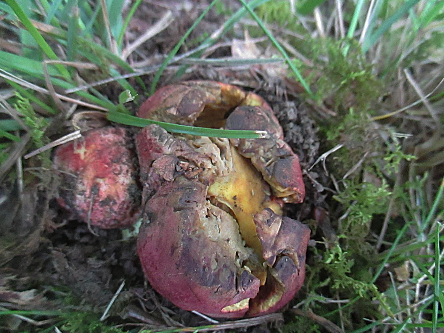 Leider waren die drei Königsröhrlinge (Butyriboletus regius) bereits wieder weggesammelt worden. Einige Meter entfernt war aber noch ein zertretener Monarch zugegen der an seiner Brust ein Baby hatte.