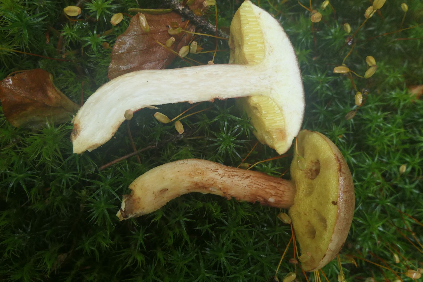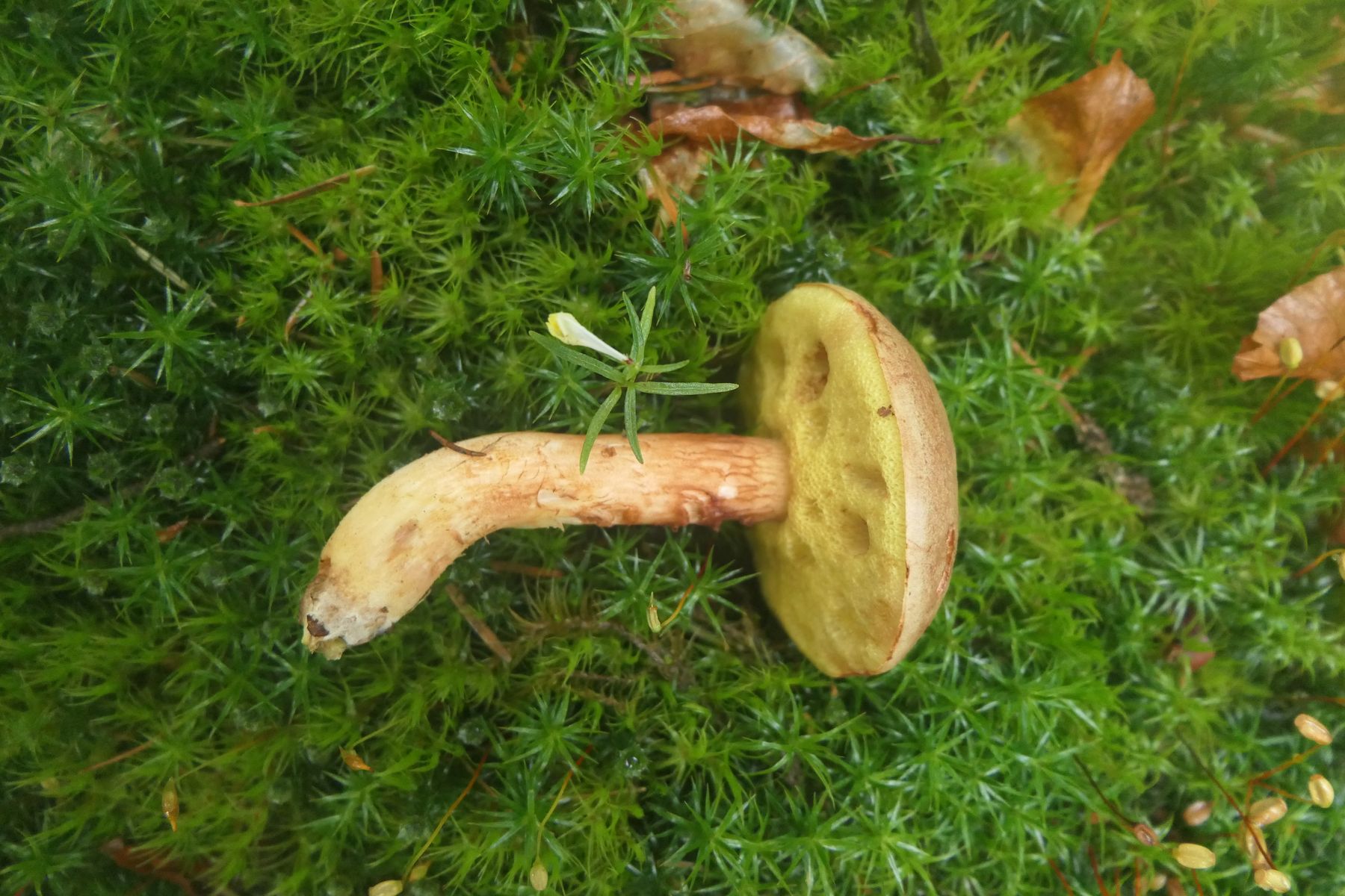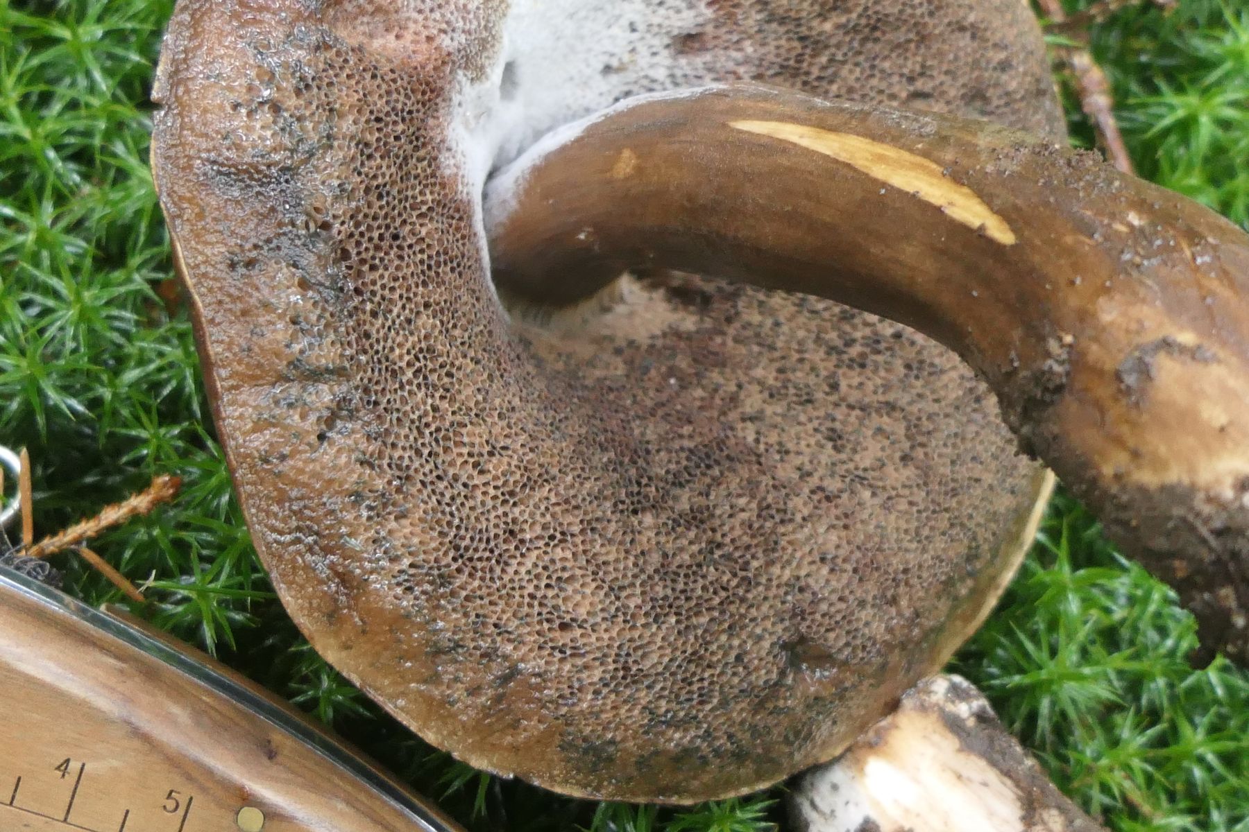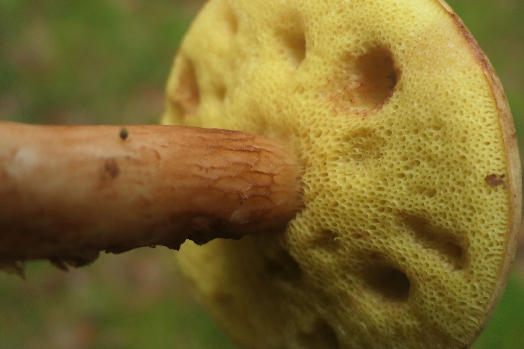 Vielleicht noch diesen Xerocomus ferrugineus - den braunhütigen Filzröhrling, weil diesmal auch mit ausgeprägtem Netz am Stiel