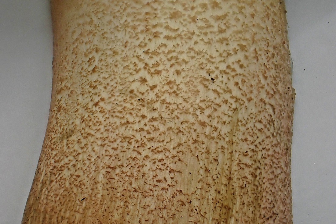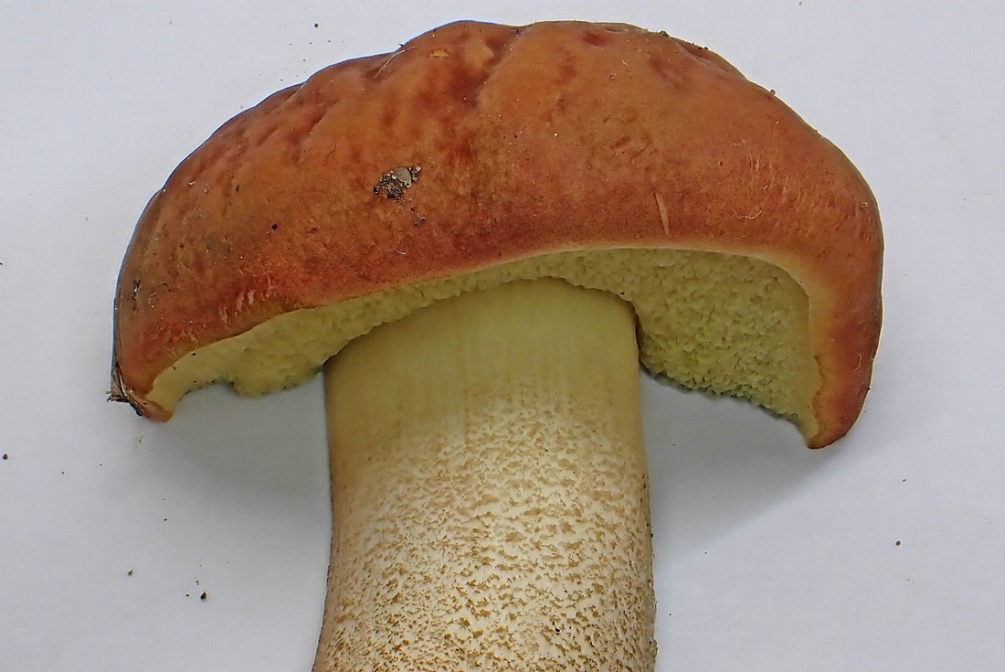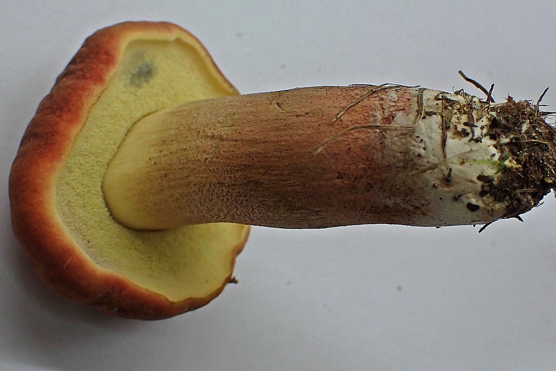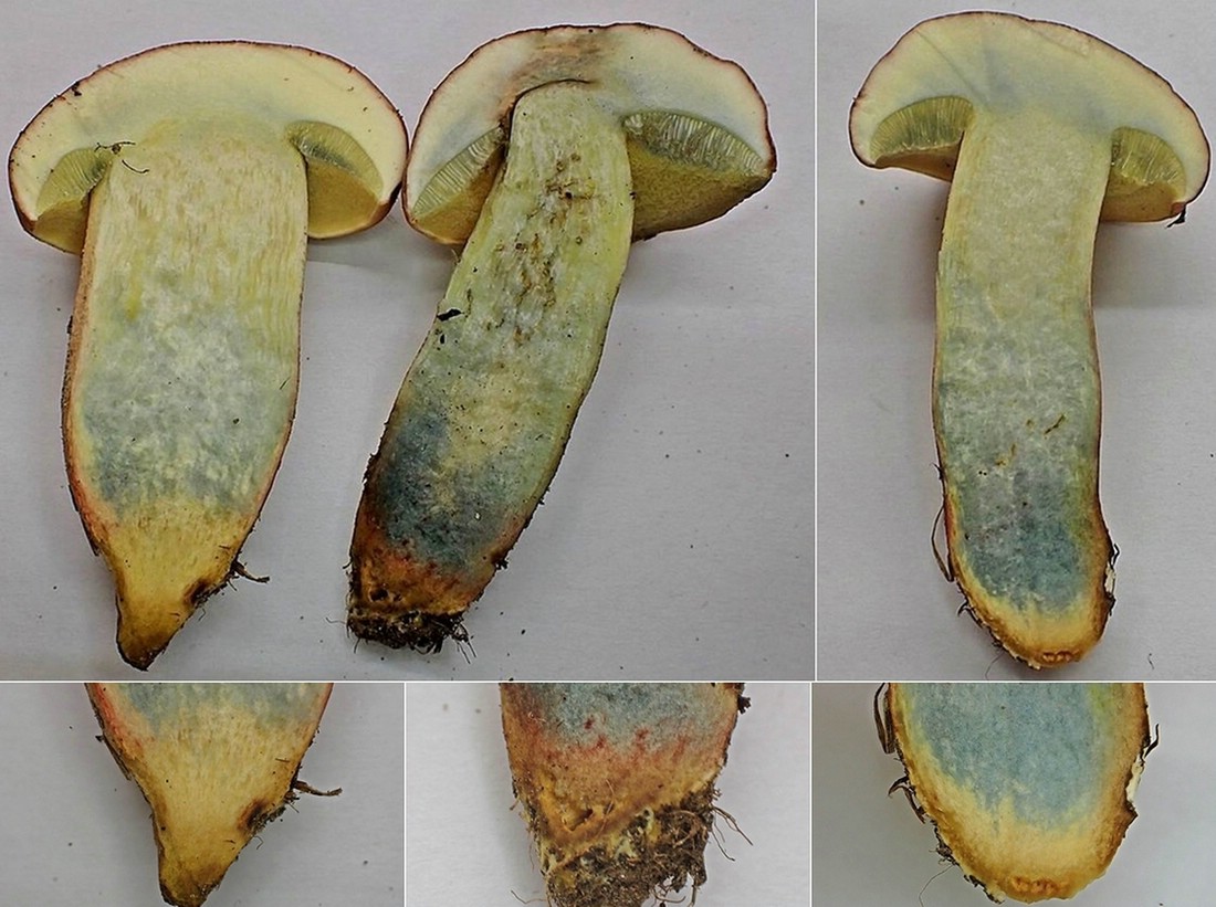 Das Fleisch war im Schnitt goldgelb, im Hut leicht und im unteren Stielbereich deutlich blauend. Orange Pünktchen in der Stielbasis habe ich vergeblich gesucht.