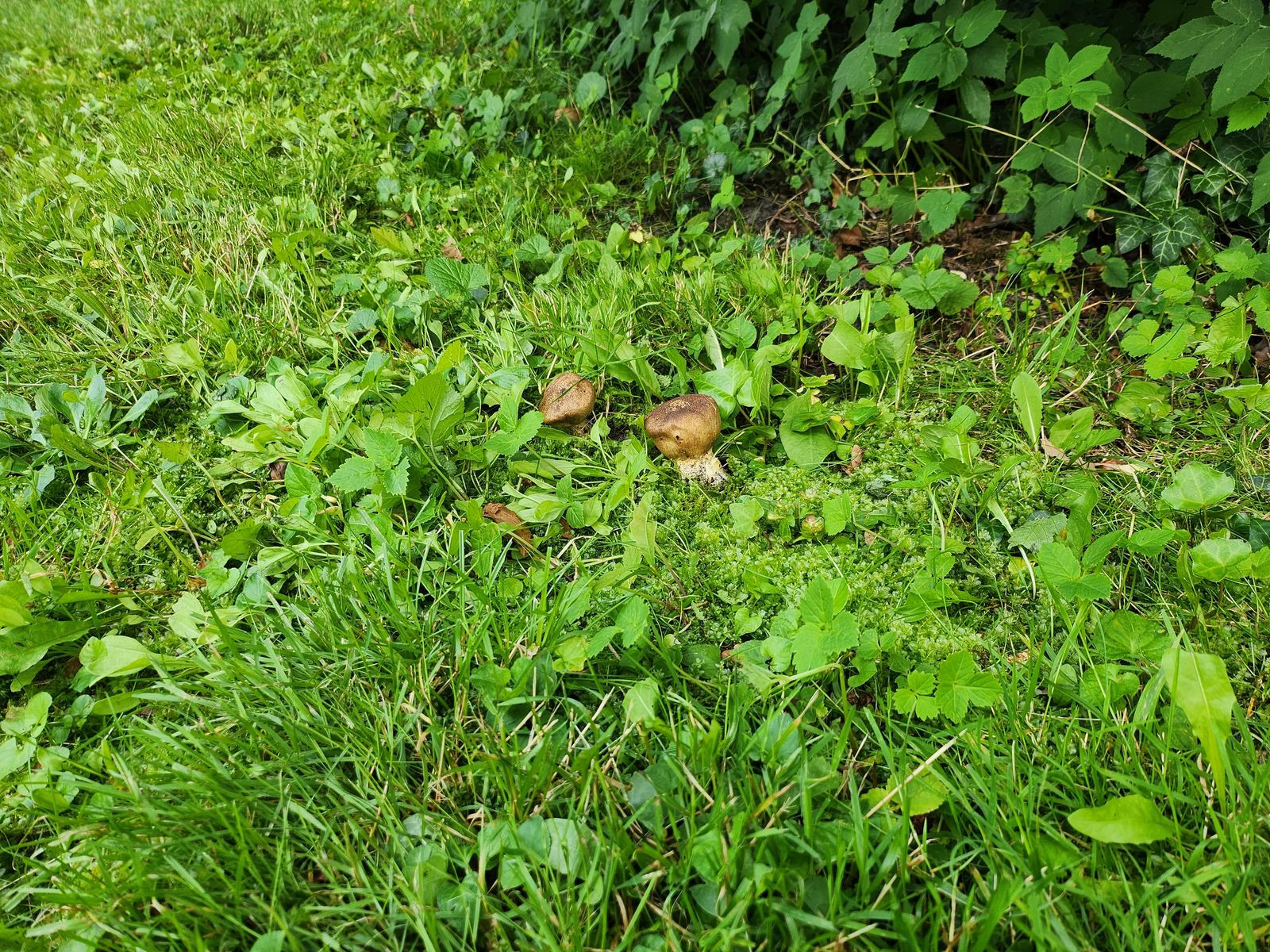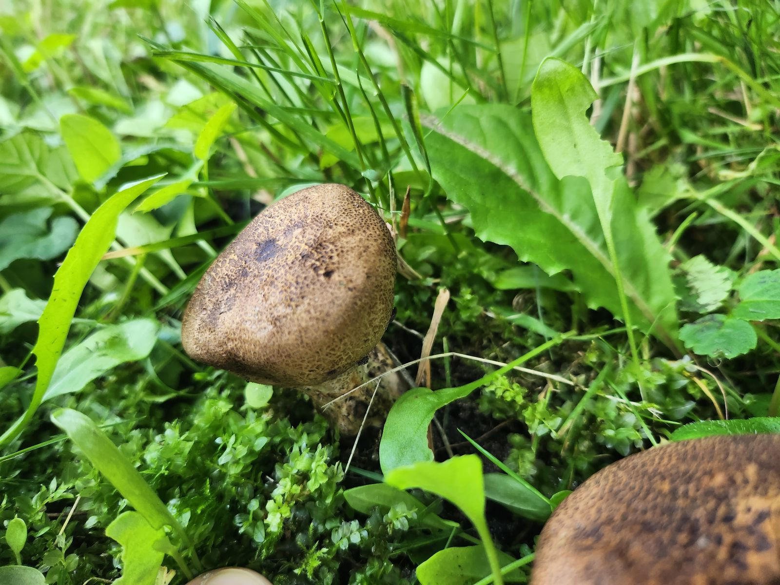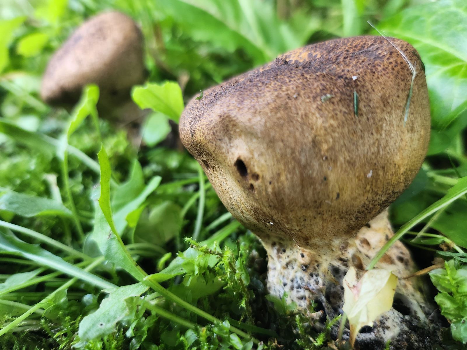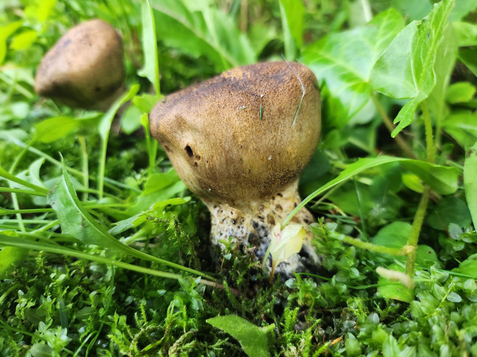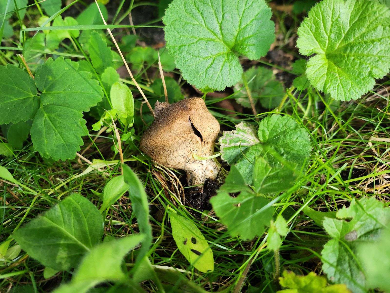 die Kinder freuen sich über zahlreiche Kartoffelboviste im Rasen und stauben sich gegenseitig an. Von oben sahen die beiden folgenden Exemplare auch aus wie Kartoffelboviste, doch dann sah ich den (angefressenen Stiel). Die Pilze sind schon reif und beim Draufdrücken staubt es. Standort: Am Rand einer moosigen Rasenfläche, in der Nähe Fichte, Rotbuche und andere Bäume.