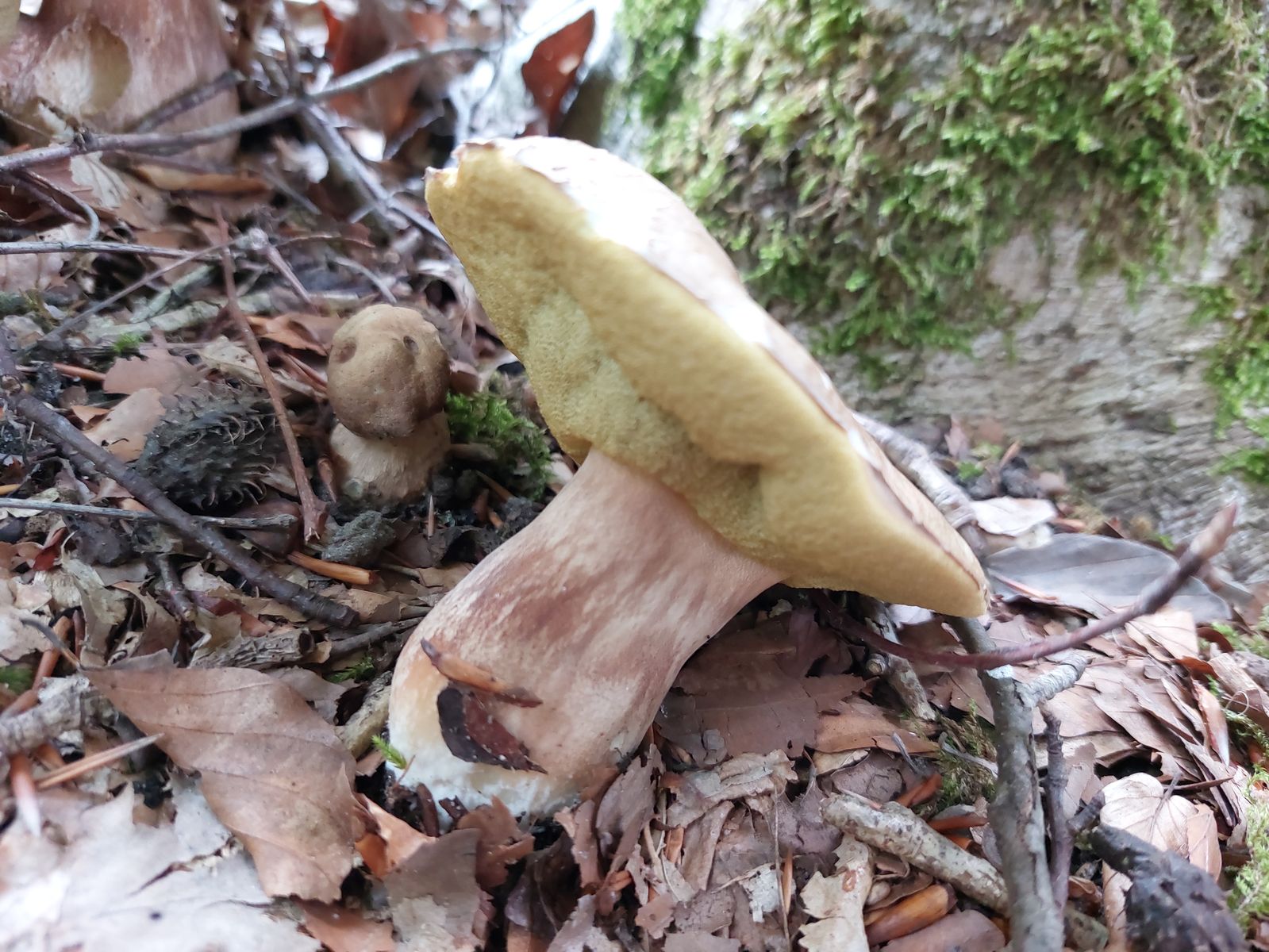 Ich war gerade los auf Steinpilzjagd und hab von weitem eine riesige Gruppe Pilze gesehen. Ich wollte mich schon ärgern, dass ich zu spät für diese Prachtexemplare bin, aber dann bin ich doch stutzig geworden. Die Röhren, auch bei den beiden jungen Exemplaren, sind gelblich bis olivgrün, auch der Hut ist für einen Steinpilz eigentlich zu hell. Der Stiel passt wieder, am Fuß ist auch nichts auffällig, der Geruch ist pilzig aber nicht 100% wie Steinpilz. Gewachsen bei einer jungen Buche.
