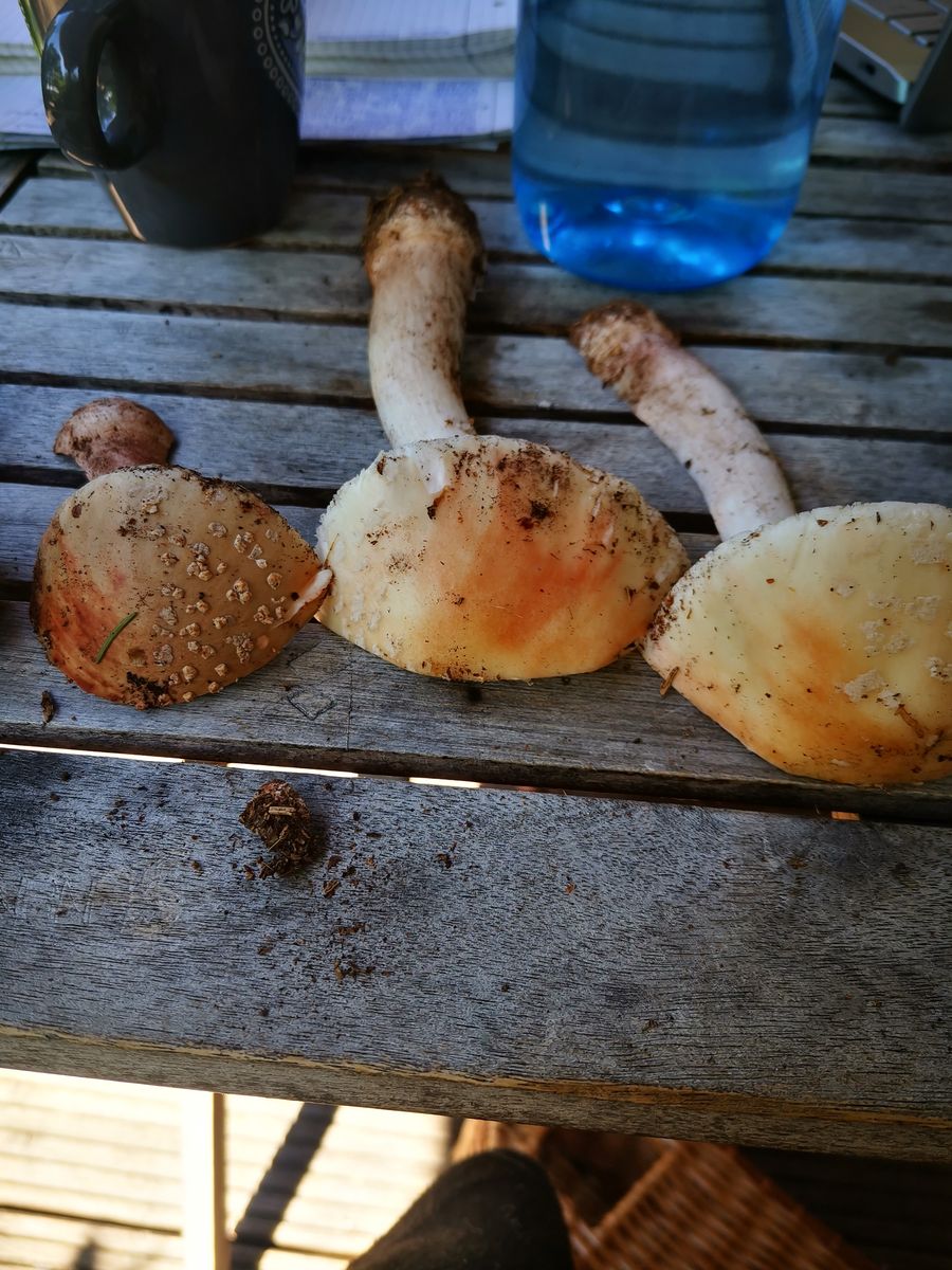 • Die gezeigten sind Perlpilze. Die können schon als Babys deutliche Rottöne haben, aber auch sehr blass, hell, ocker sein und Rötungen nur sehr dezent zeigen. Ältere Fraßspuren, die Warzen an der Stielbasis, die Subcutis sind häufig gute Zeichen für Rot.
