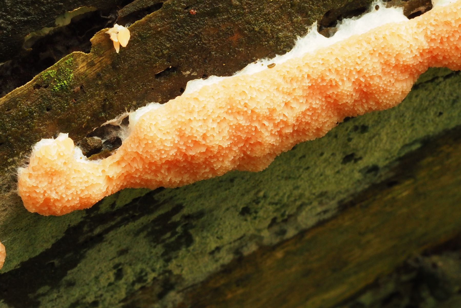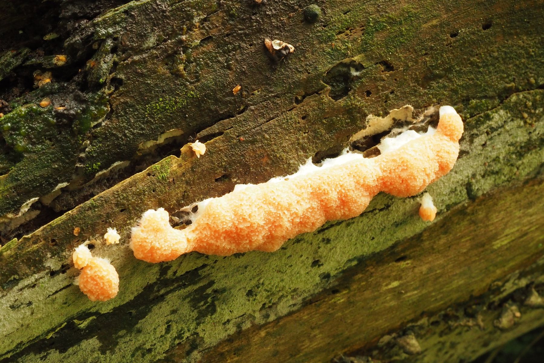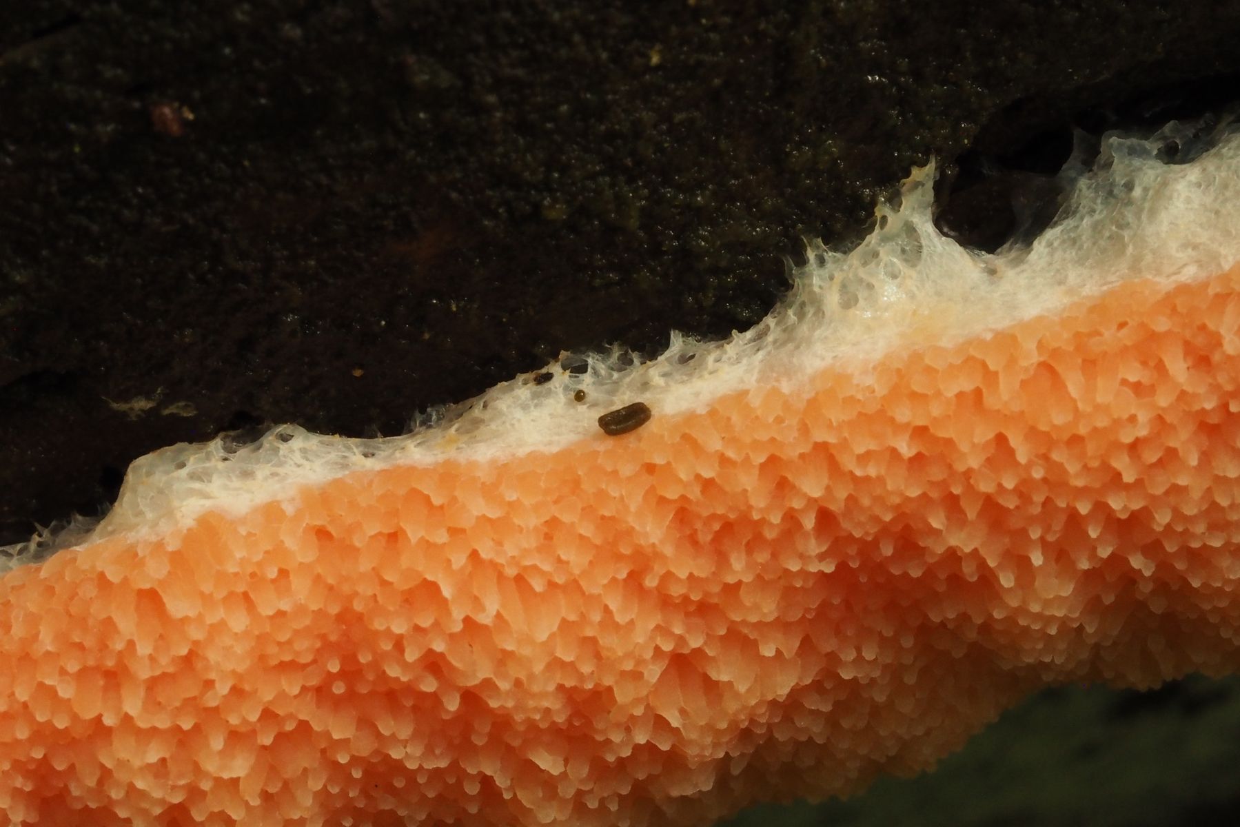 Meine Vermutung geht zu Tubifera ferruginosa, deutsche Bezeichnungen: Fischeierschleimpilz, Lachsfarbener Schleimpilz, Lachsschleimpilz oder auch Lachseierschleimpilz. Gibt es dazu Bestätigungen oder kommt auch etwas Anderes in Frage?