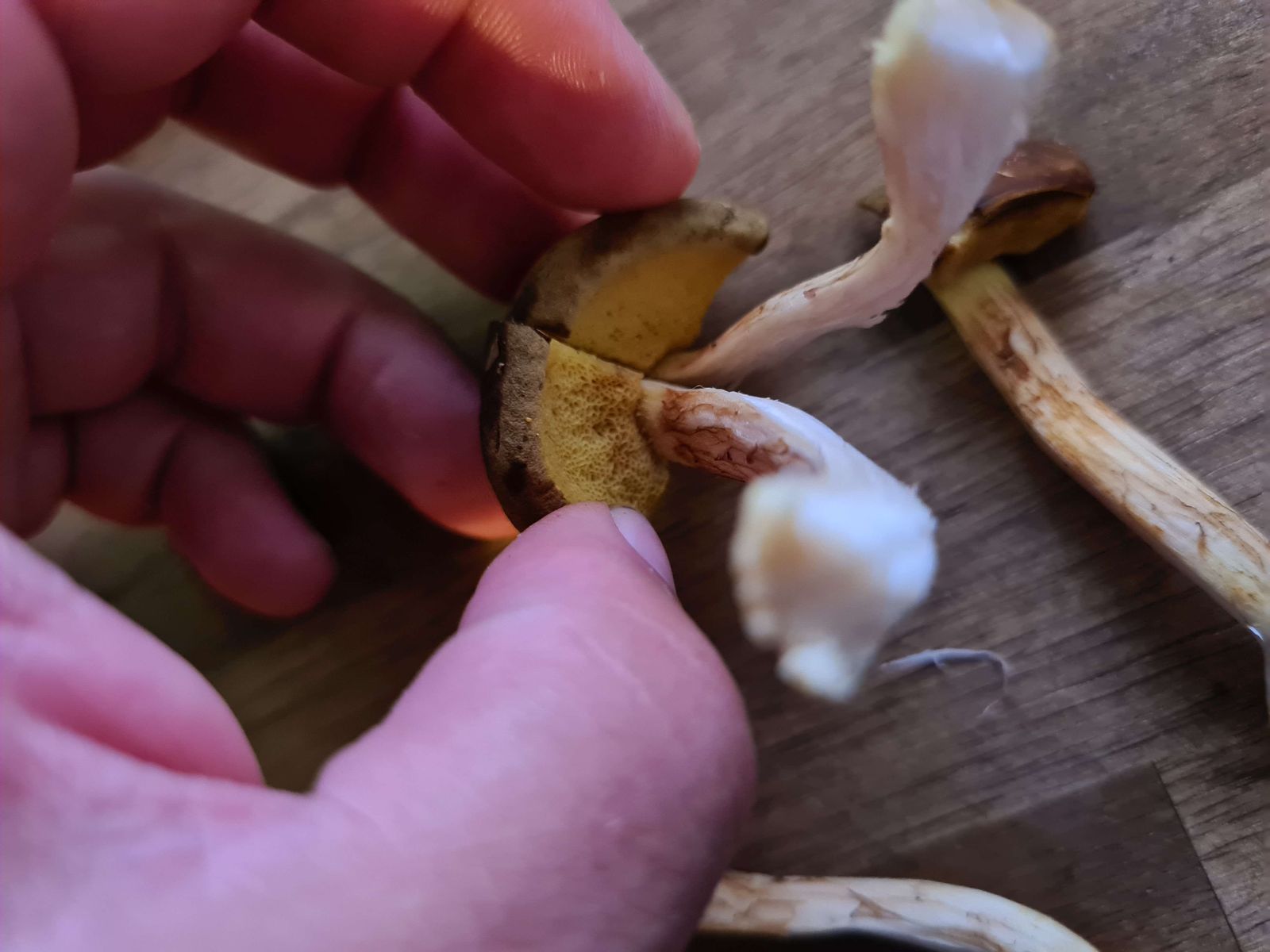 ich habe einen Röhrling gefunden und finde einfach nicht heraus um welchen es sich hier handelt. Er hat eine auffällig dunkle Kappe, die geht schon fast ins schwarze (dunkelbraun), in der Mitte vom Hut wird er auffallend dunkler und ist schon eher schwarz. Er hat außerdem einige Stecknadelgroße Schwarze Punkte auf dem Hut. Die Röhren sind gelblich, das Fleisch ist weiß. Der Stiel ist recht dünn und weiß, mit ein paar braunen Streifen die sich über die gesamte Stiellänge ziehen. Der ist kaum wahrnehmbar eher Pilzig. Geschmack ist roh sehr mild. Gefunden habe ich ihn in einem Fichtenwald auf Moosboden.