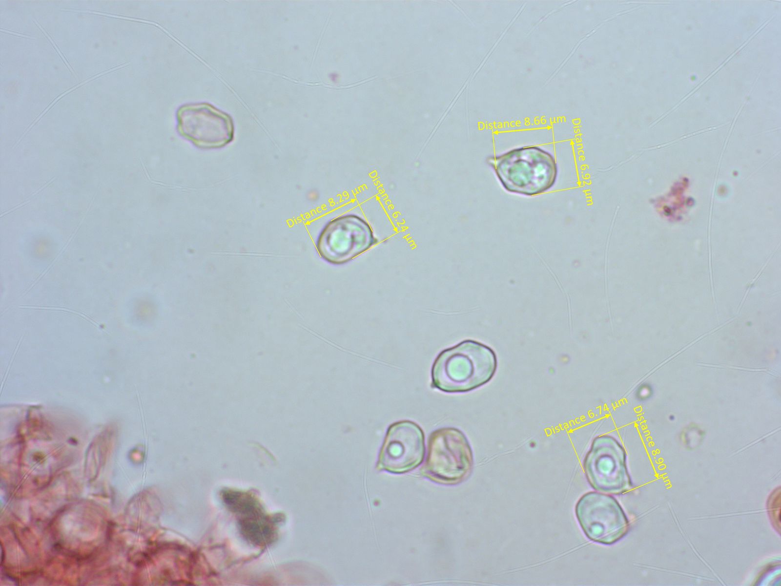 Sporen etwa 10.5-12.5 x 8-9 µm. Basidien 4-sporig, keine Zystiden, keine Schnallen.