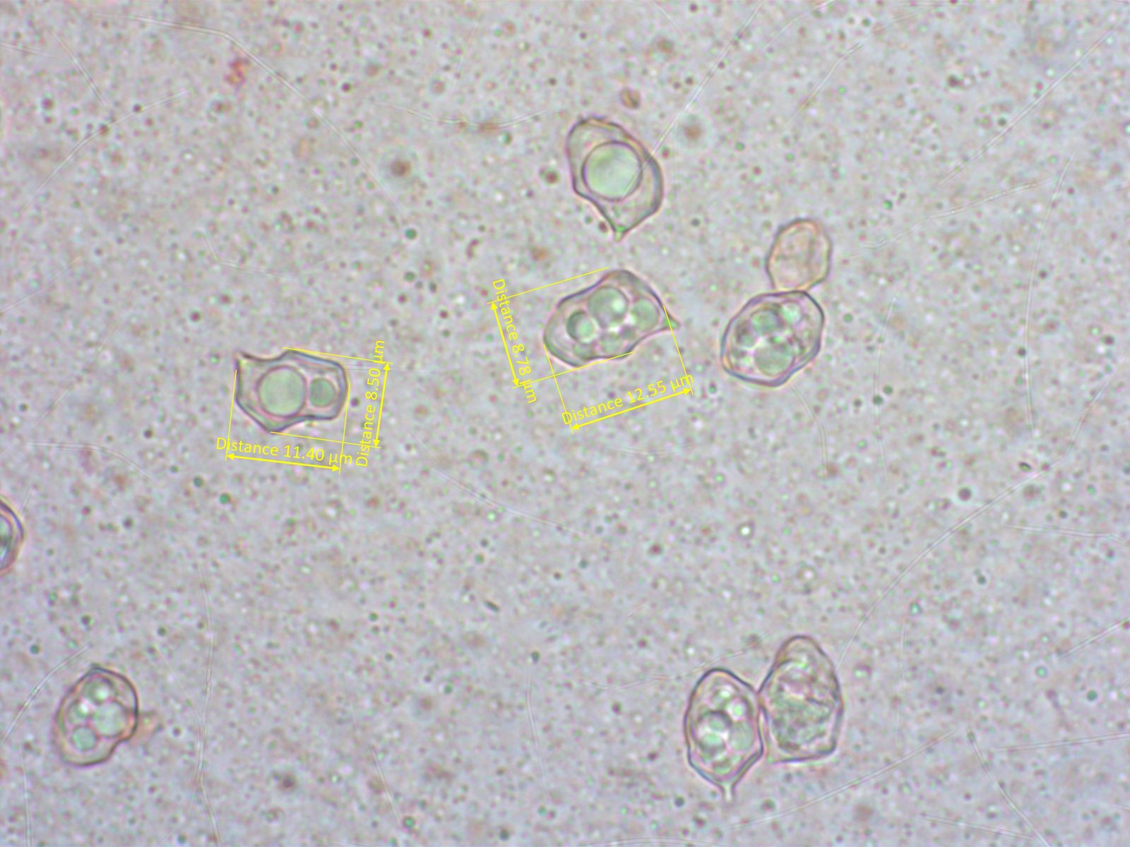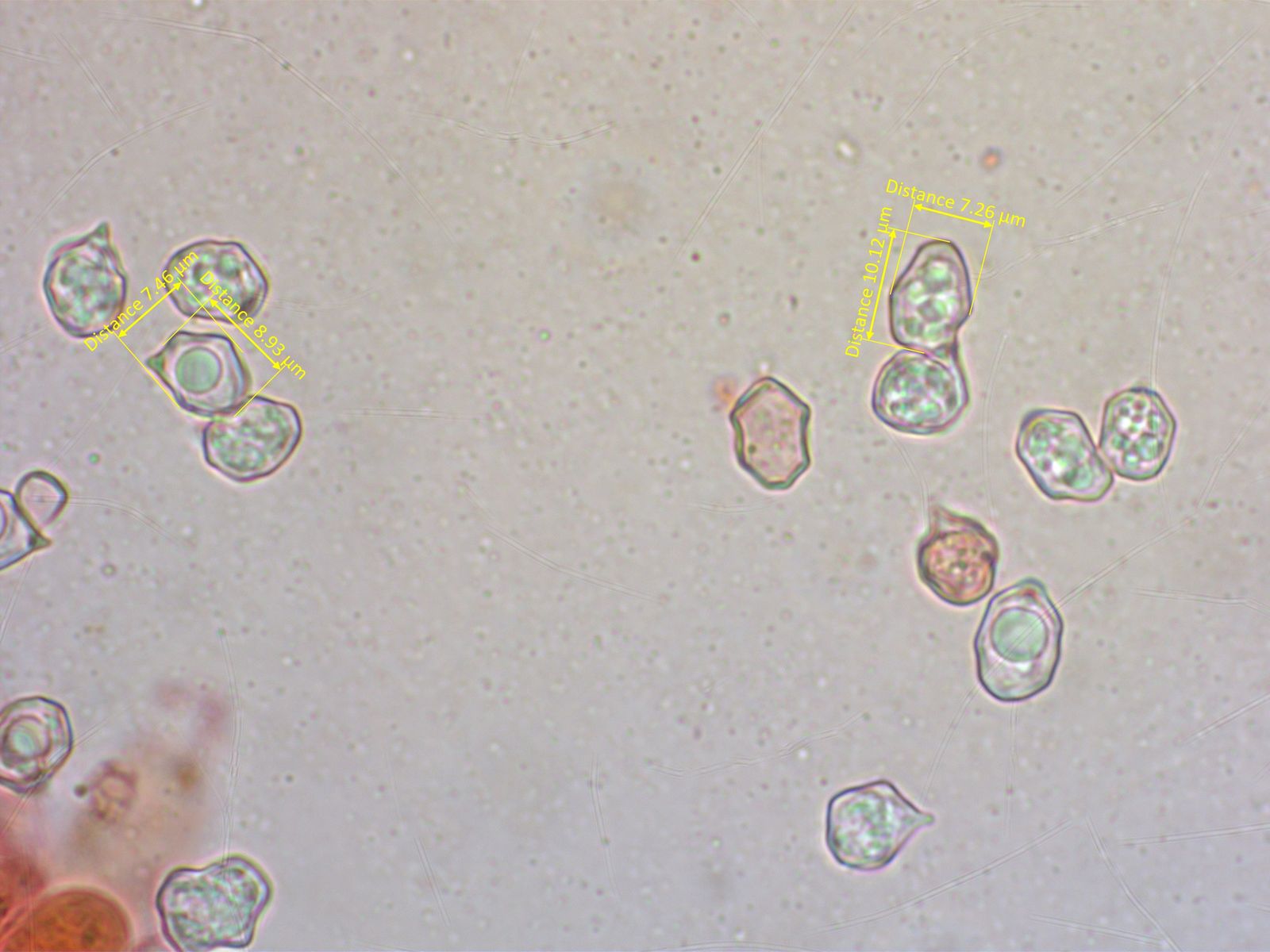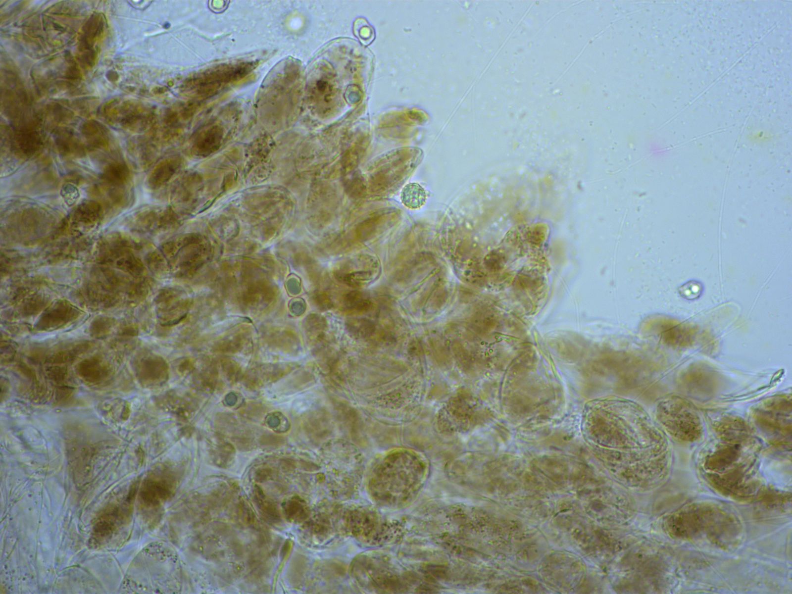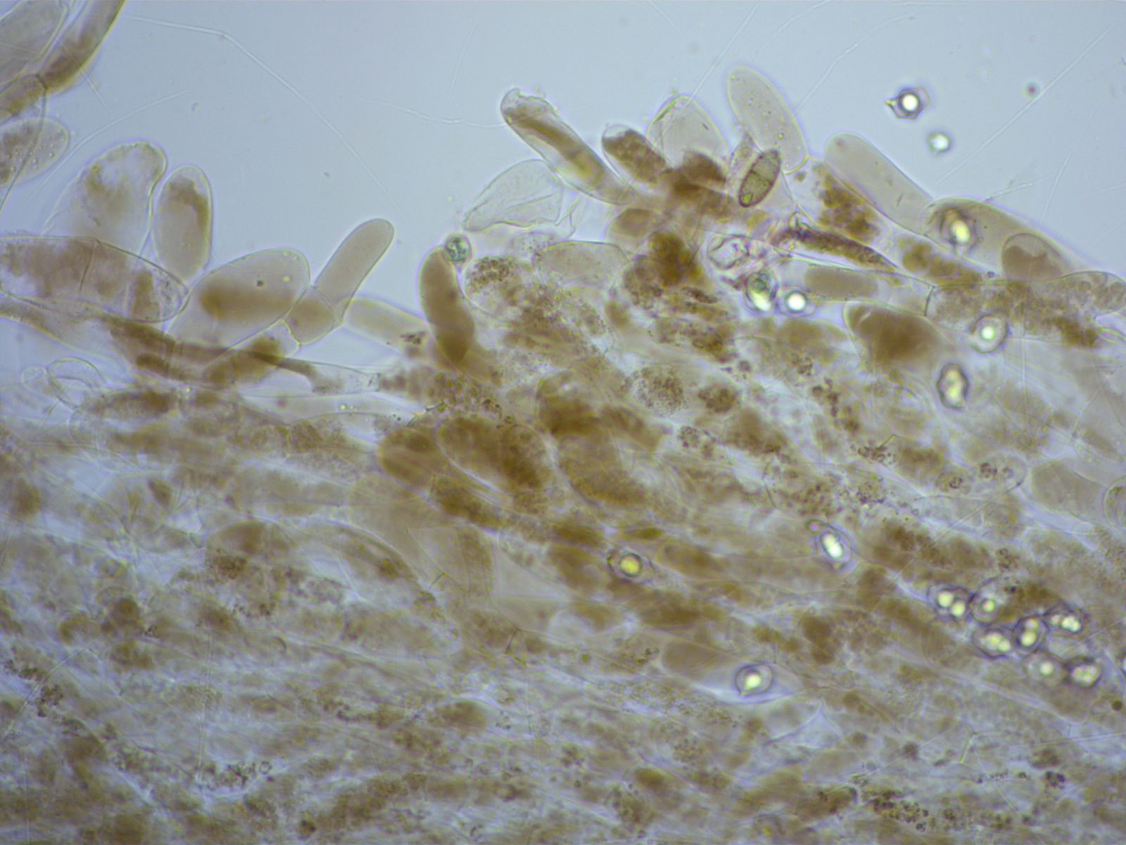 Sporen wieder ähnlich, 11-12.5 x 7.5-8.5 µm. Basidien 4-sporig, keine Schnallen.