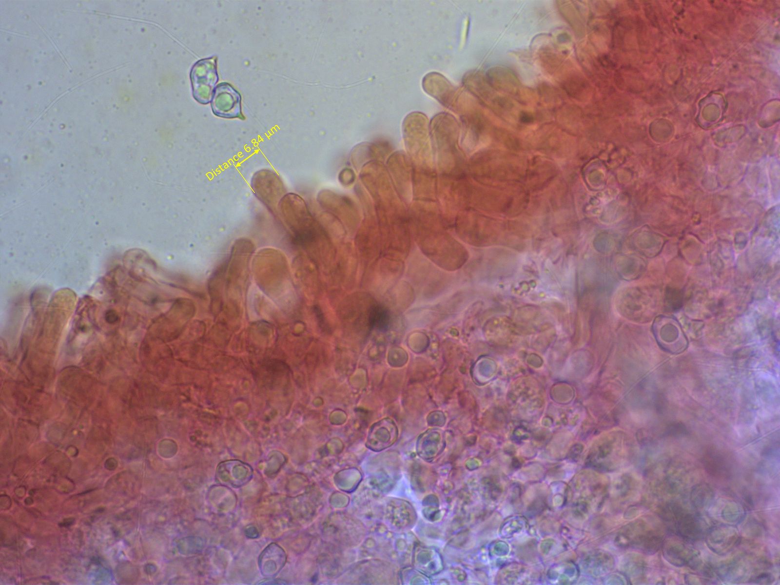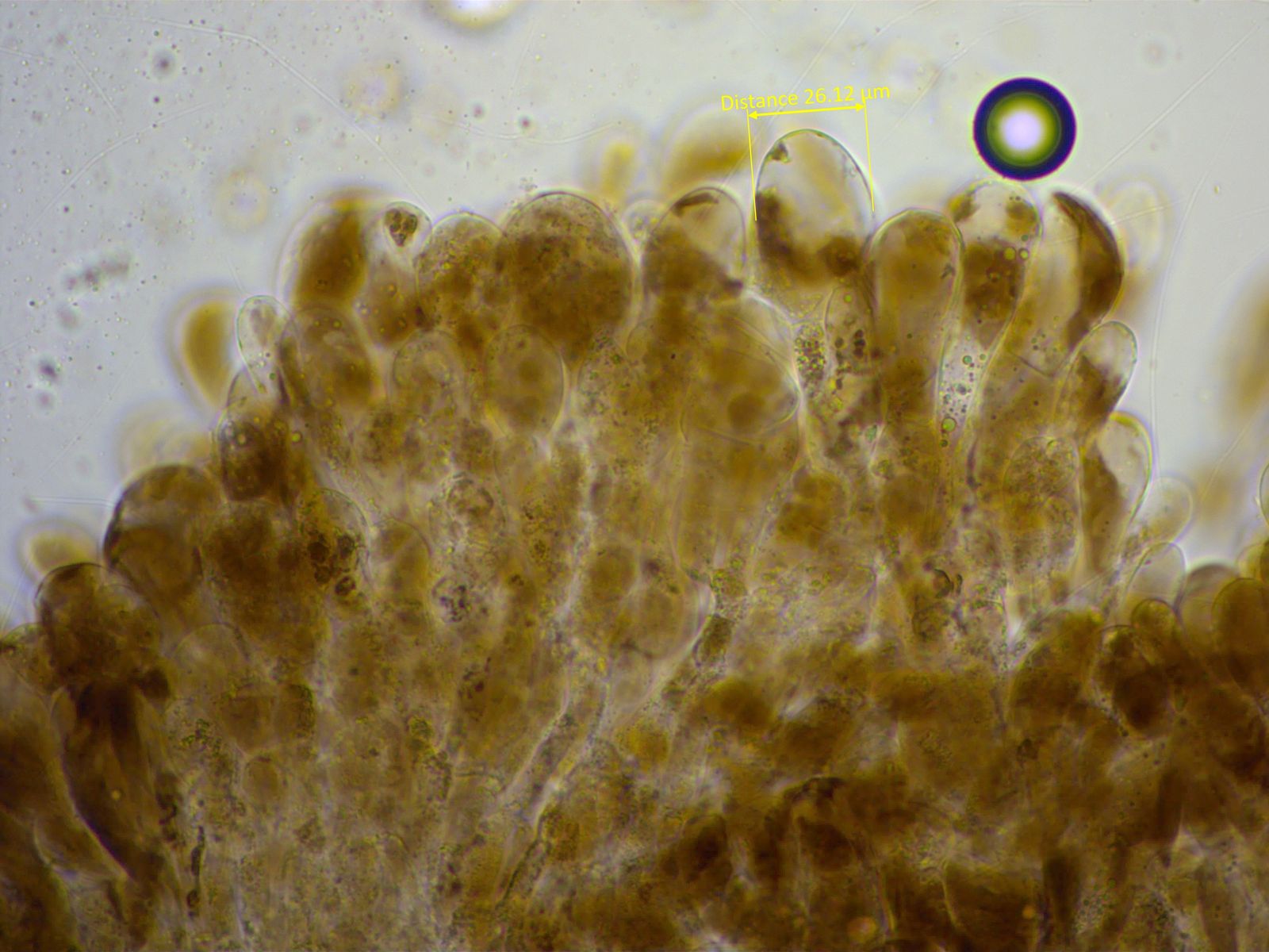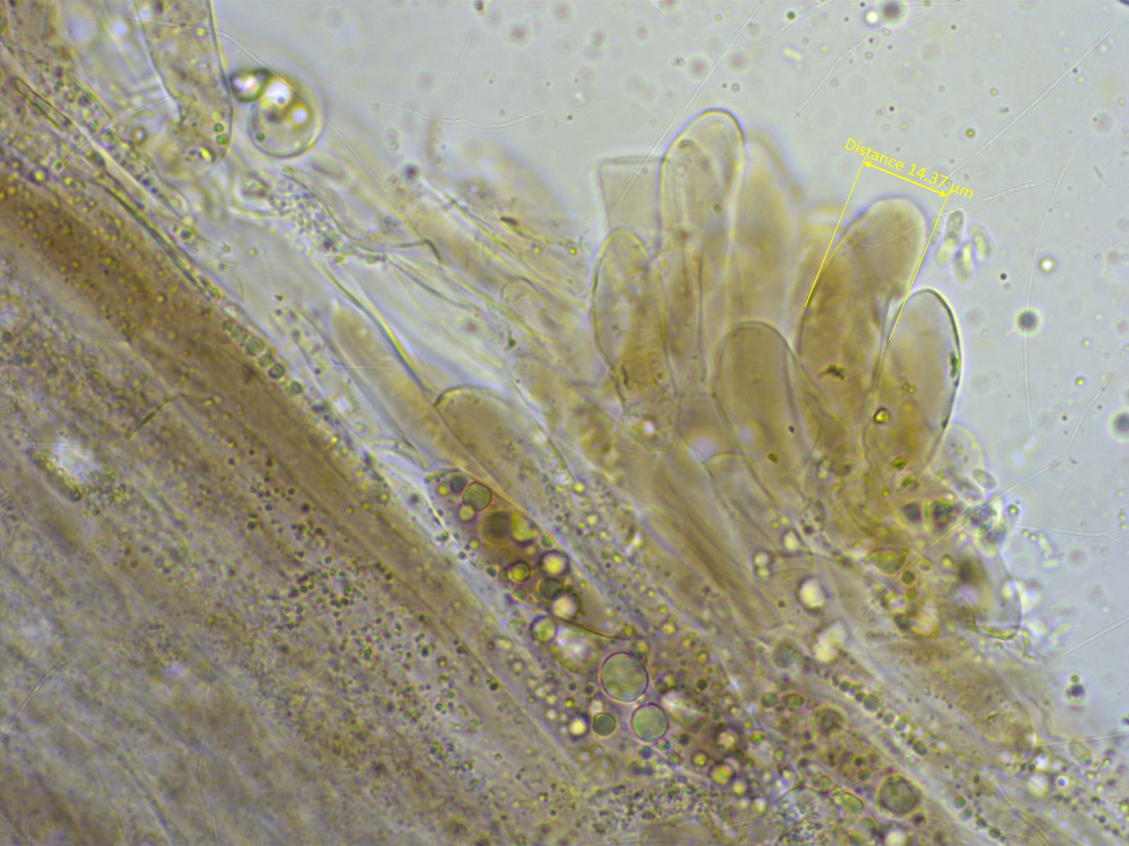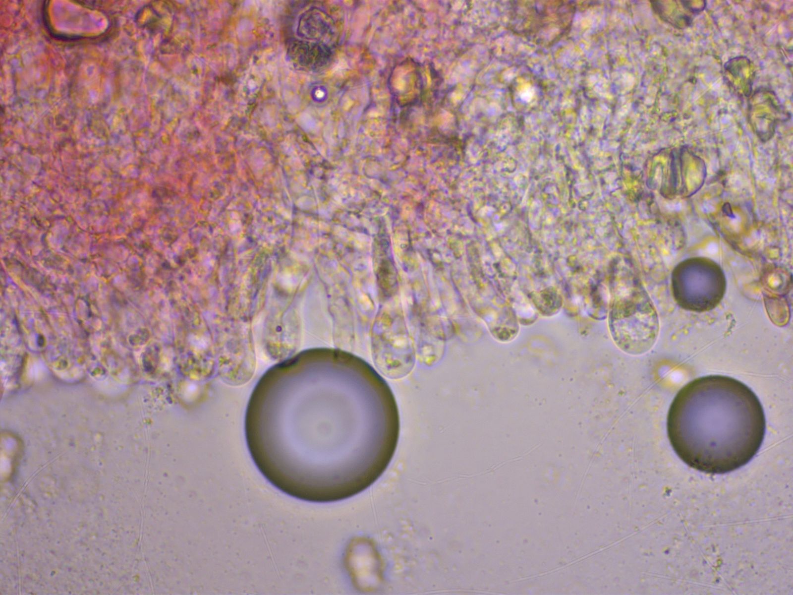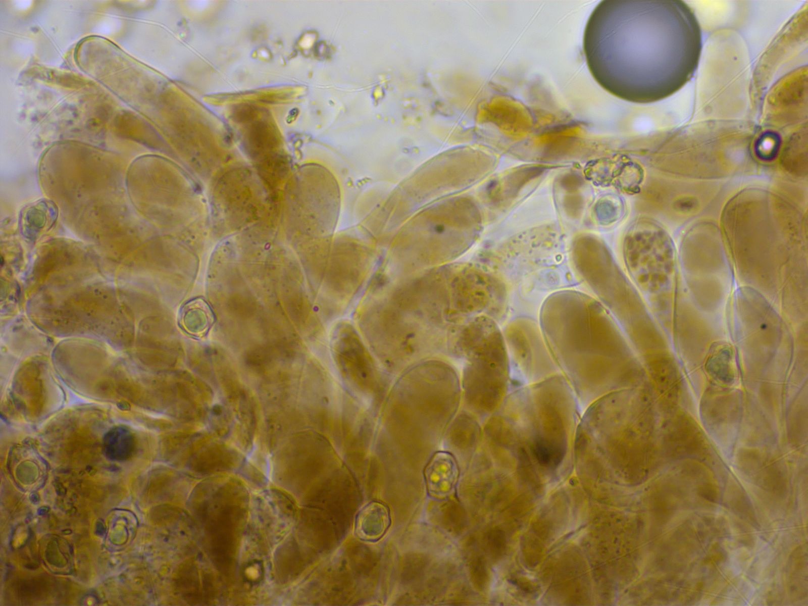 Dieser hier hat eine sterile Lamellenschneide mit sehr vielen zylindrischen oder schwach keuligen, teils septierten Cheilozystiden.
