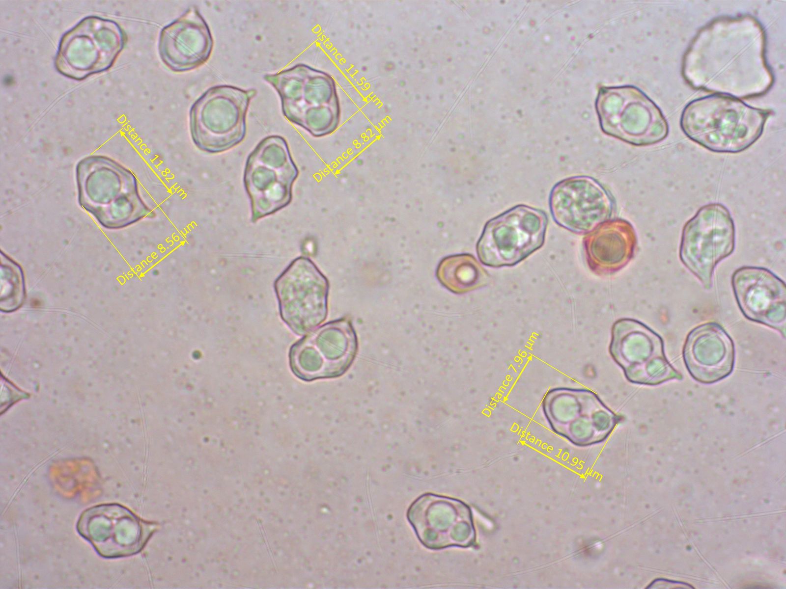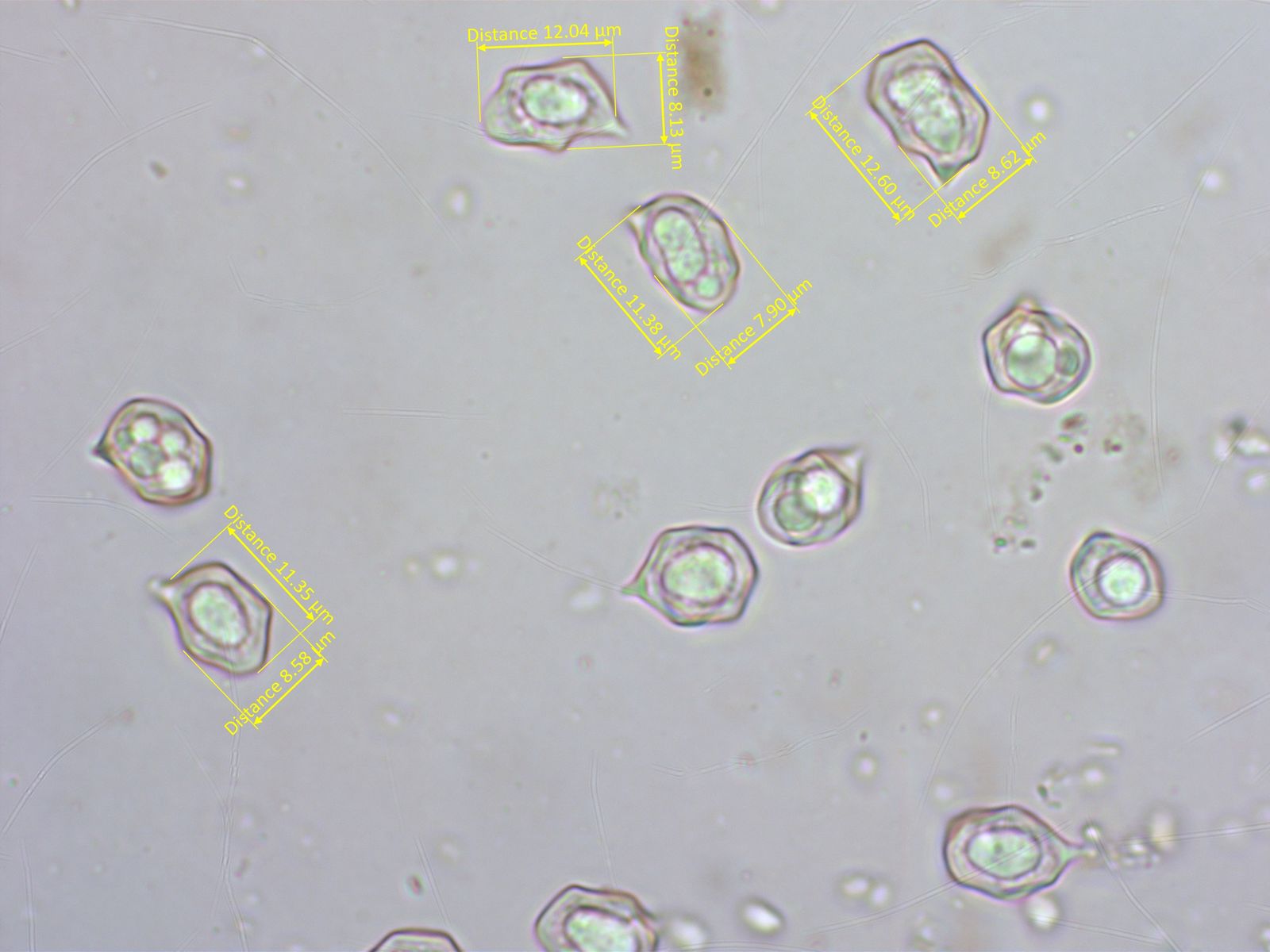 Sporen heterodiametrisch, Ecken abgerundet, teils eher knotig als eckig. Etwa 10-12 x 7-9 µm.