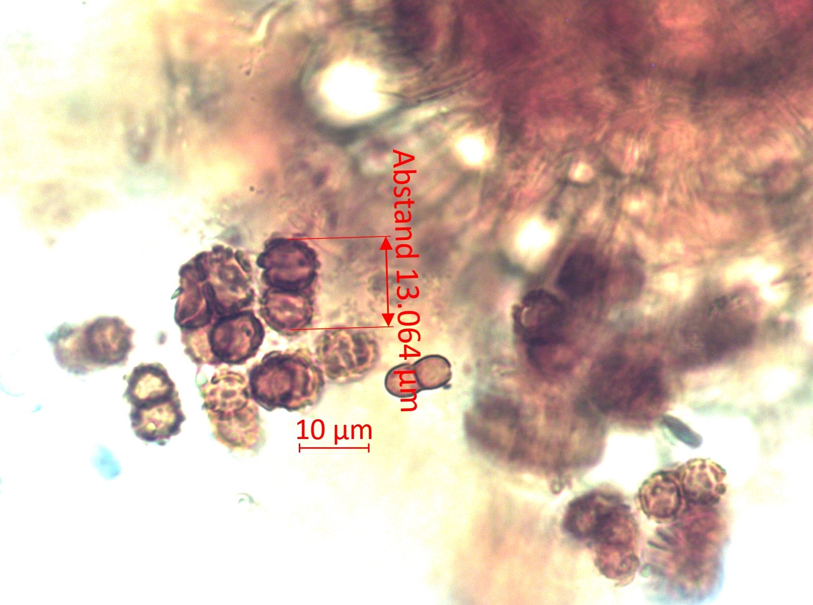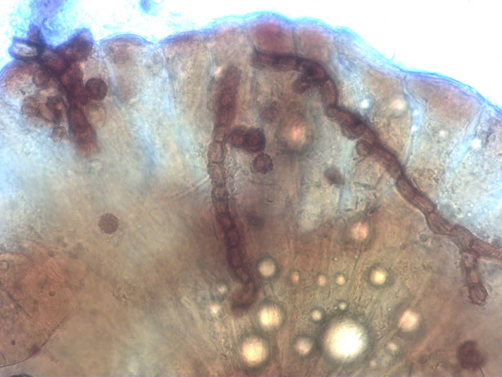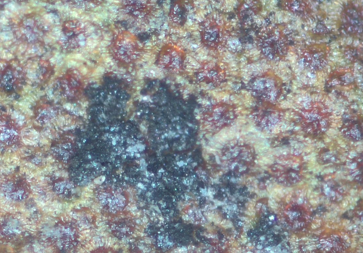 Aus purer Neugier wie immer habe ich die Unterseite eines Blattes einer Alpenrose unter der Stereolupe betrachtet, danach im Mikroskop, wobei mir die kugeligen und warzigen braunen "Sporen" bzw. vielkernigen Sporangien, wenn ich das richtig interpretiere, auffielen.