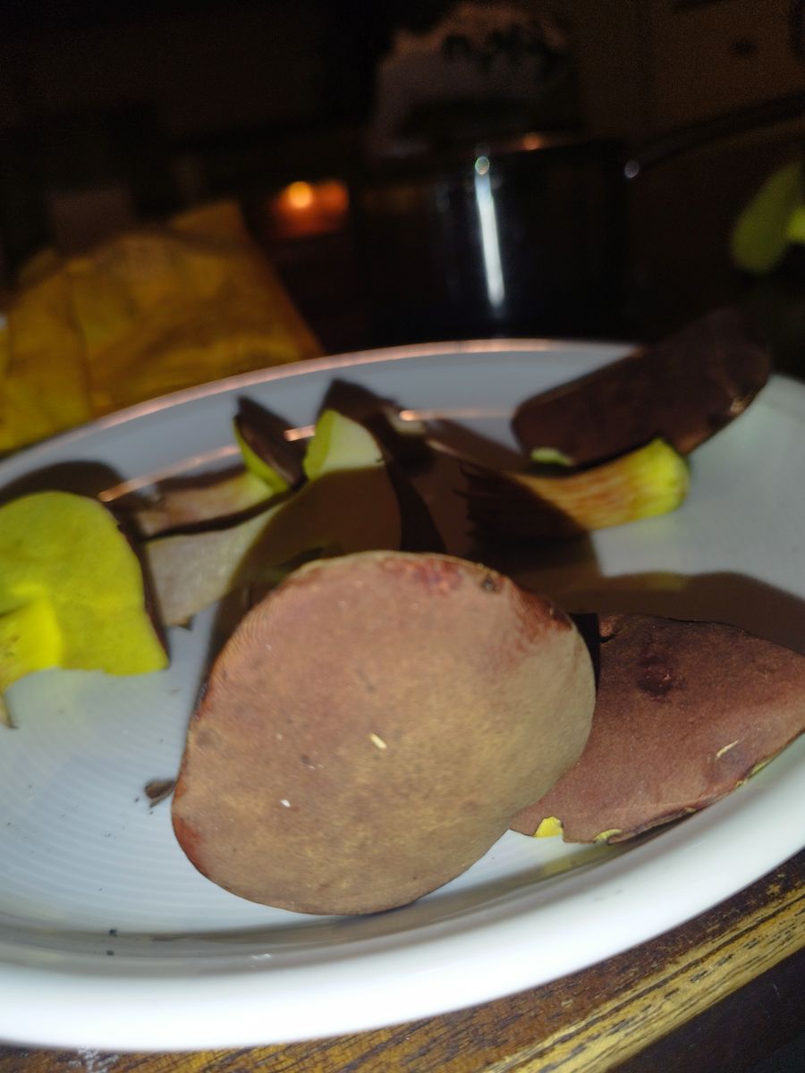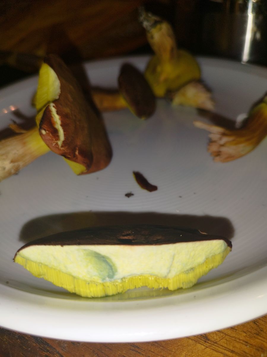heute im Mainzer Wald fand ich ein paar dieser hübschen Röhrlinge. Ich ging zuerst von Ziegenlippen oder Maronenröhrlingen aus, allerdings wunderte ich mich über die starke Gelbfärbung des Stiels unterhalb des Huts. Einen Rotfußröhrling schloss ich aufgrund der wenig bis fehlenden Rötung des Stiels aus. Auffällig ist zudem die leichte Blaufärbung des Hutfleischs nachdem ich diese etwas eingedrückt habe.