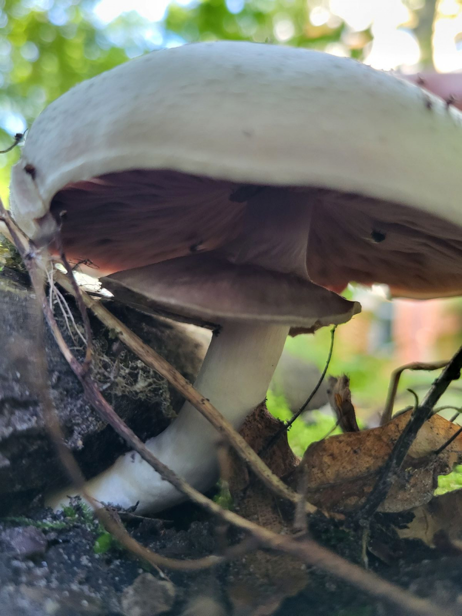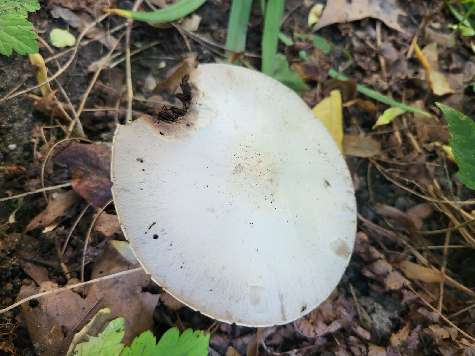 Etwa einen Meter daneben stand noch ein Pilz, allerdings war da Hut da komplett aufgeklappt, also mit Kante rundherum. Kein Ring mehr und schlierige schwarze Lamellen. Ist das ein alter Champignon oder ggf etwas anderes? Der löste sich fast Tintlingshaft auf.