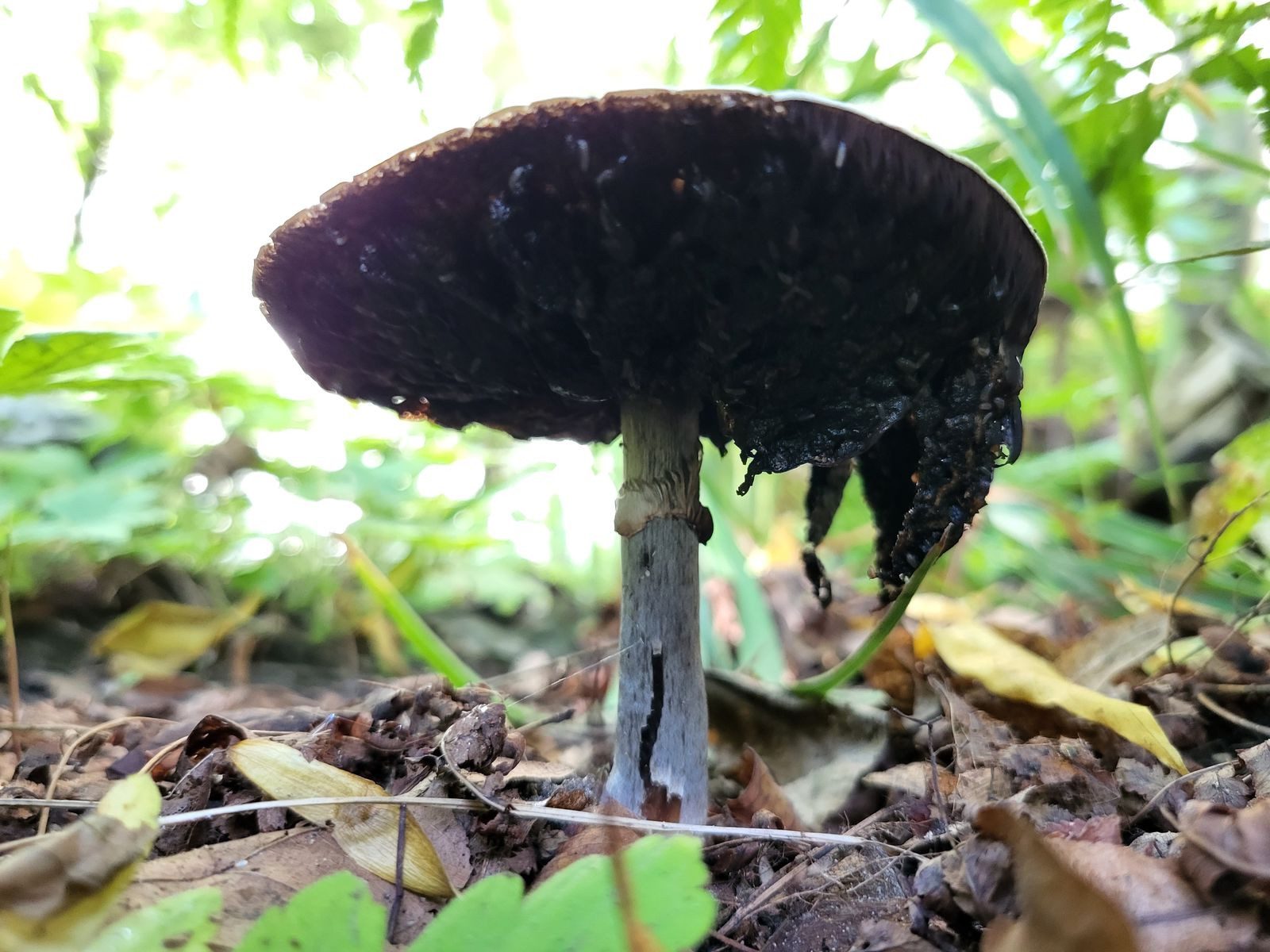 Etwa einen Meter daneben stand noch ein Pilz, allerdings war da Hut da komplett aufgeklappt, also mit Kante rundherum. Kein Ring mehr und schlierige schwarze Lamellen. Ist das ein alter Champignon oder ggf etwas anderes? Der löste sich fast Tintlingshaft auf.