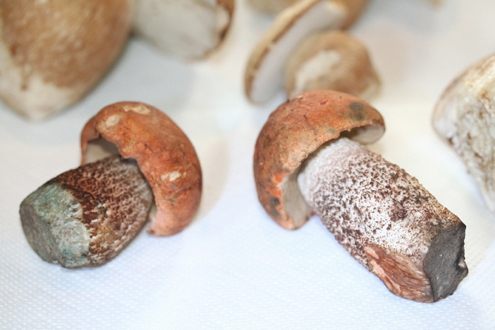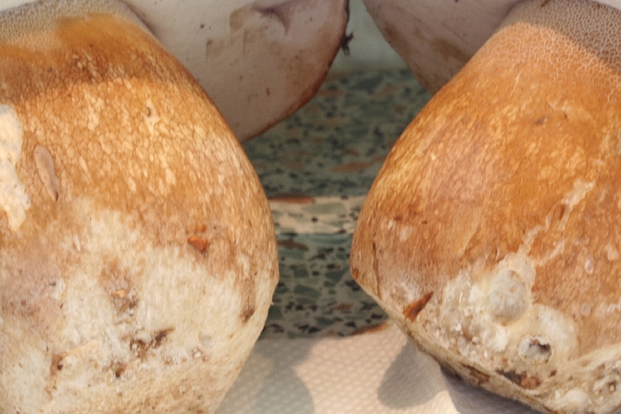 Die beiden Nahaufnahmen von den Stielen (ich schrieb ja, dass sie nahezu identisch aussehen) zeigen links den großen, hellhütigen Sommersteinpilz und rechts den mit dem dunkelbraunen Hut.