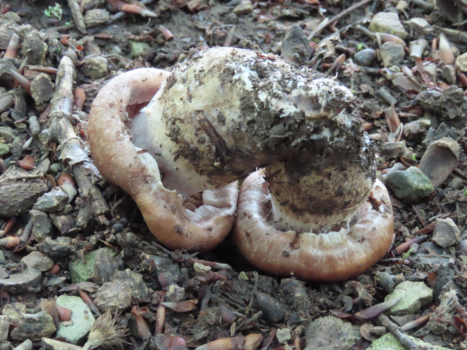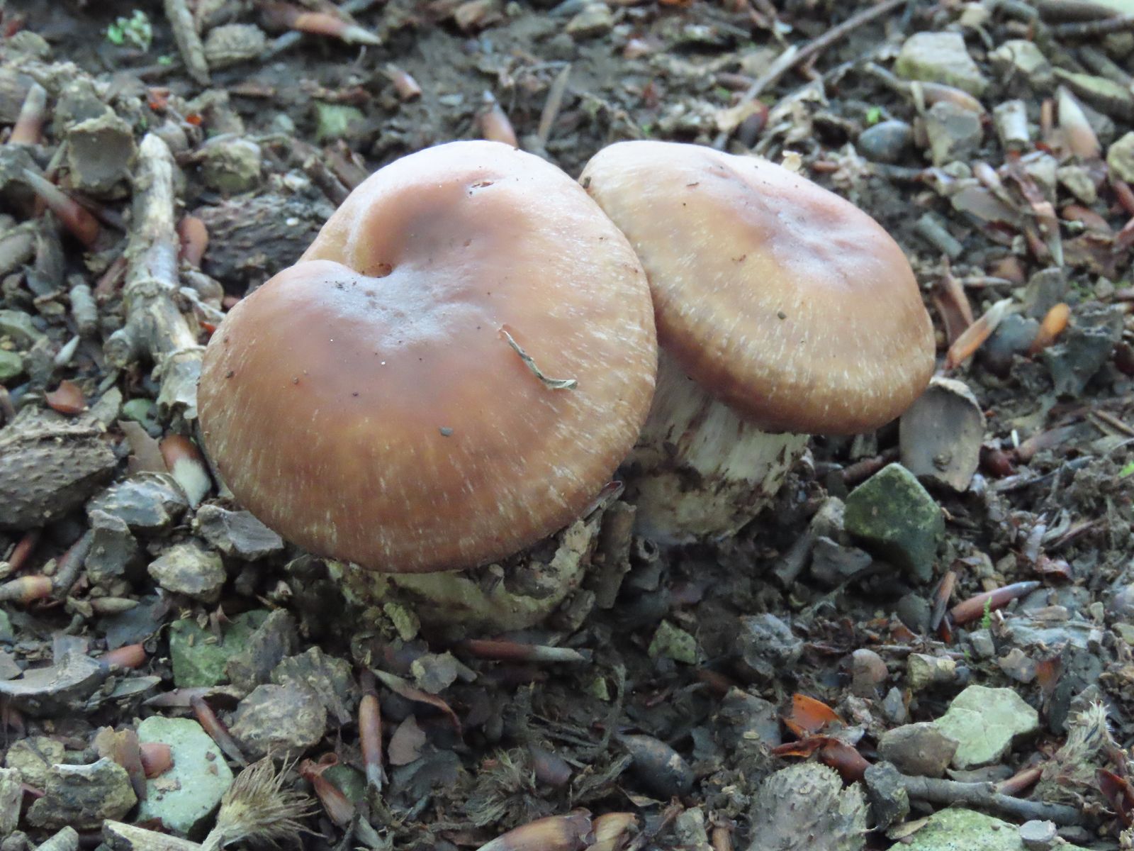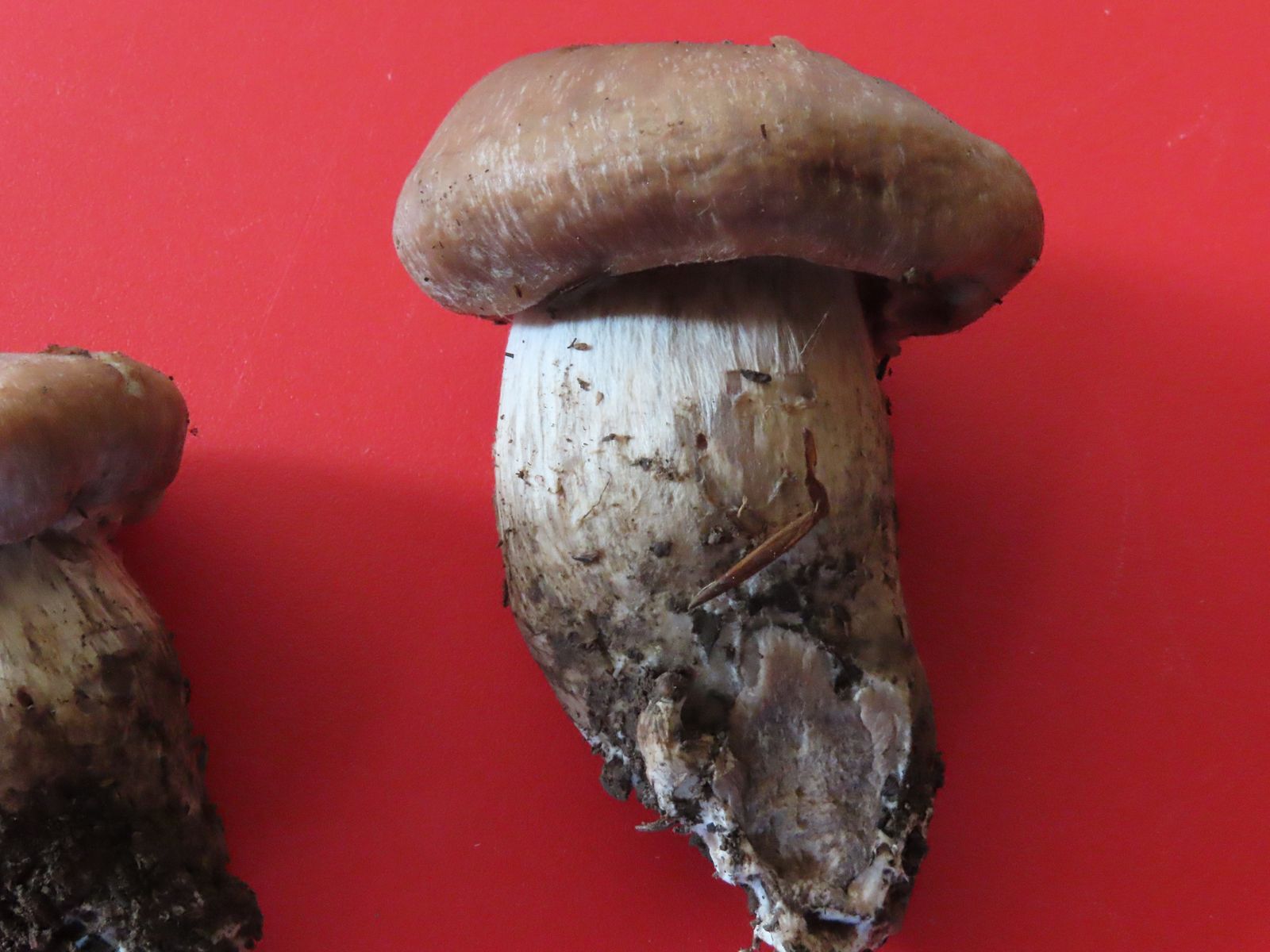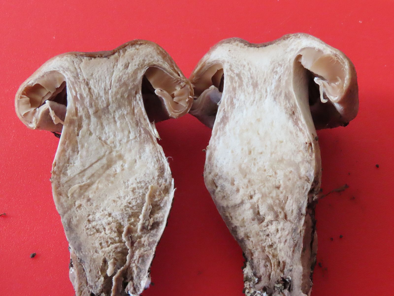 Hut braun, Hutmitte vertieft, leicht radialfaserig, Rand stark eingerollt.