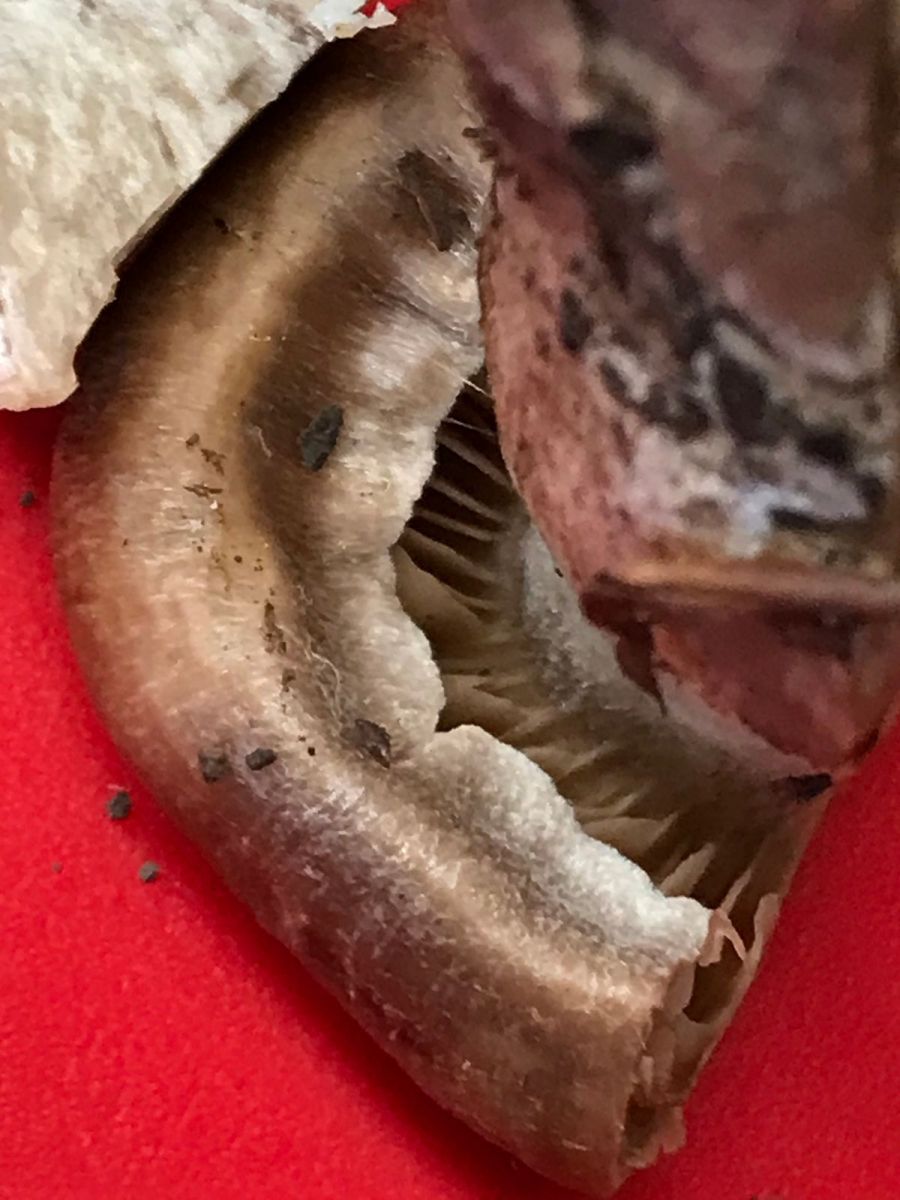 Lamellen braun, angewachsen und entfernt stehend mit welligen Schneiden.