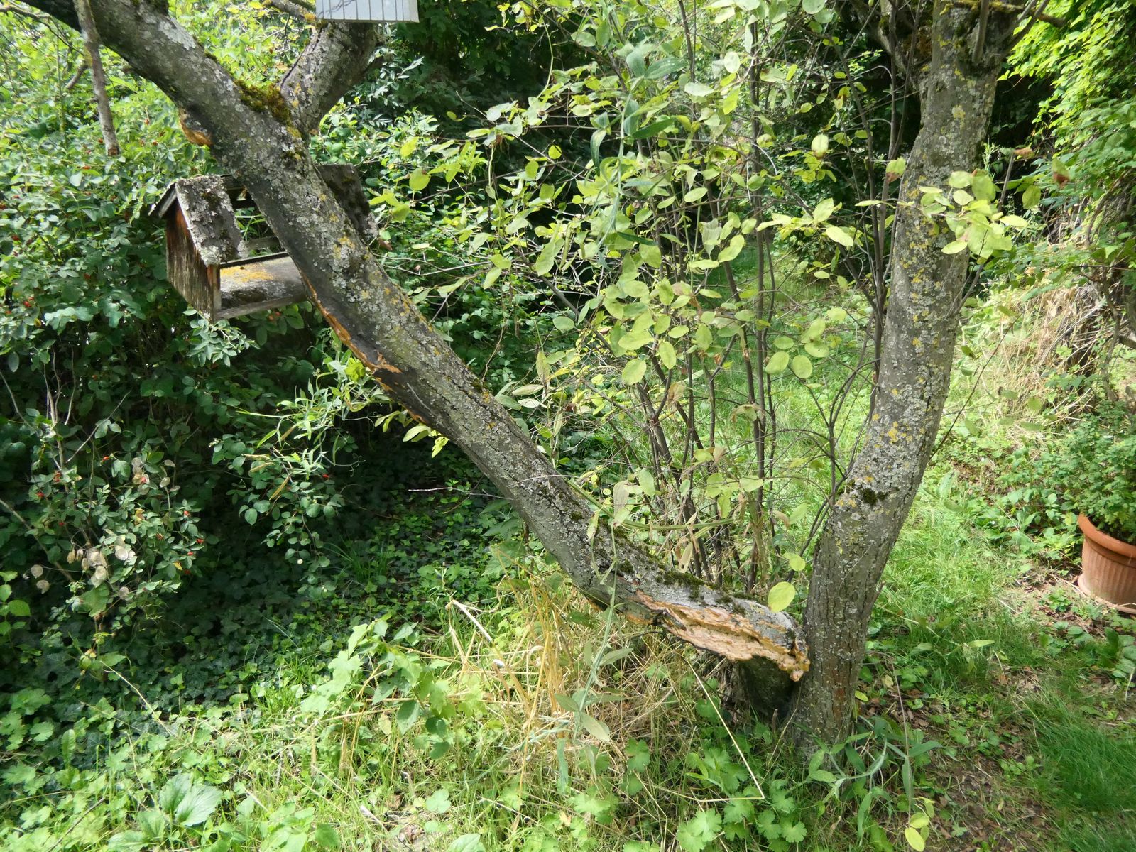 Bild 1 Aufplatzender Haupast an Felsenbirne: Der linke Ast blieb heuer ohne Blätter - jetzt weiß ich weshalb!