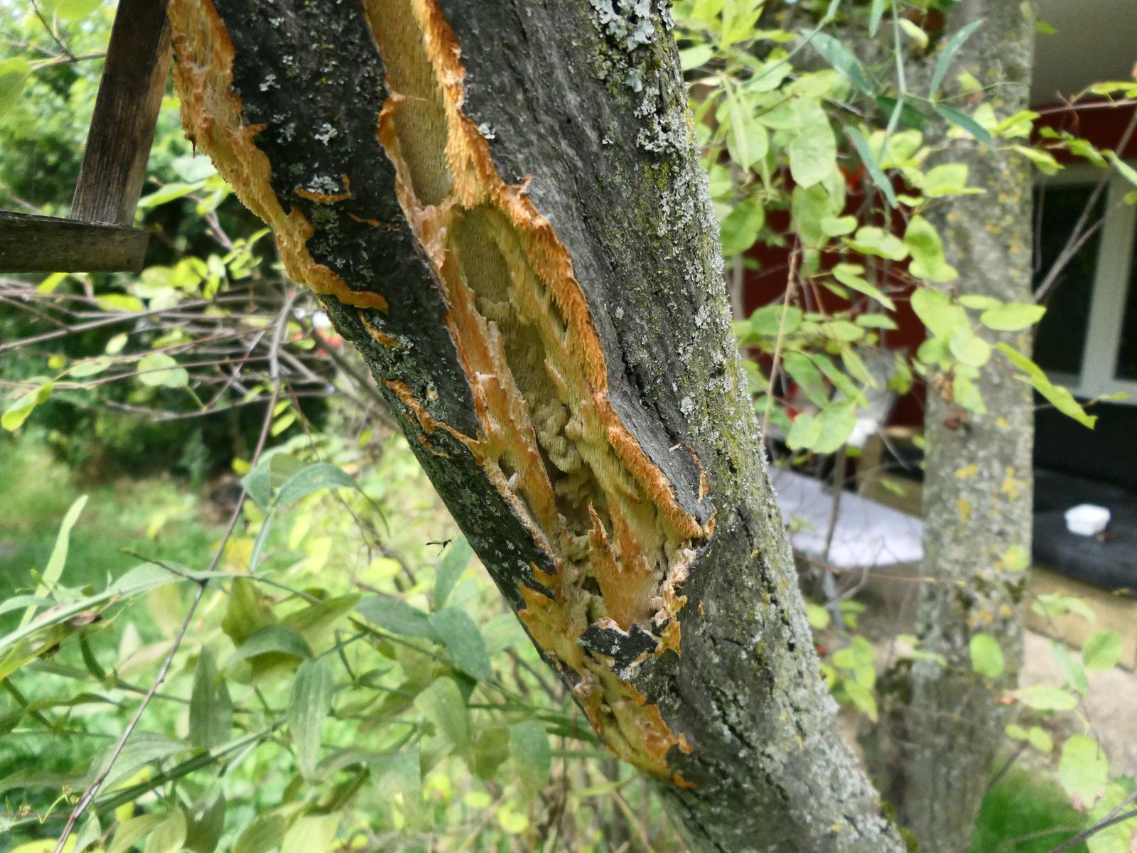 Die Rinde hat dadurch Risse bekommen, die bestimmt als Eintrittspforte dienten.