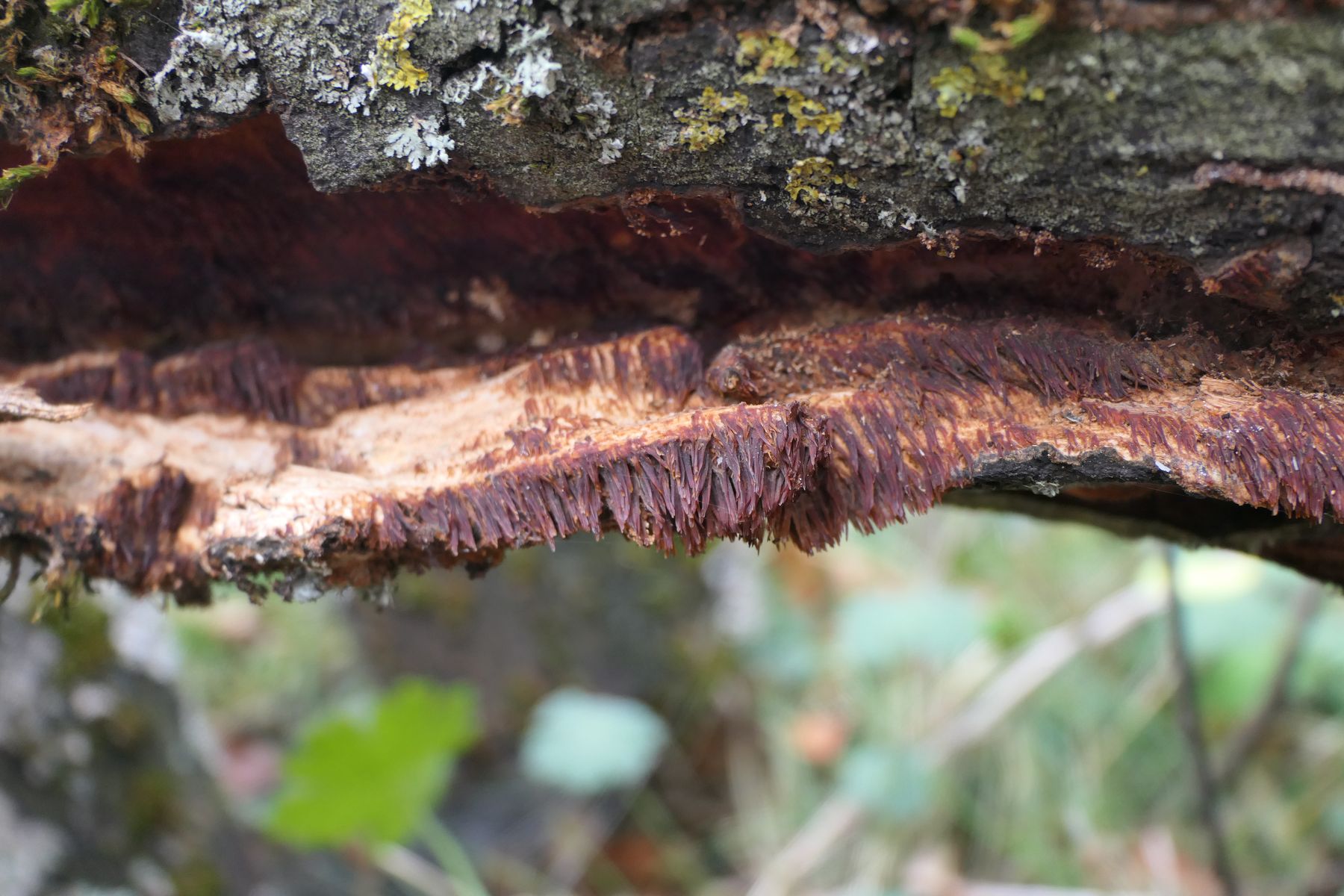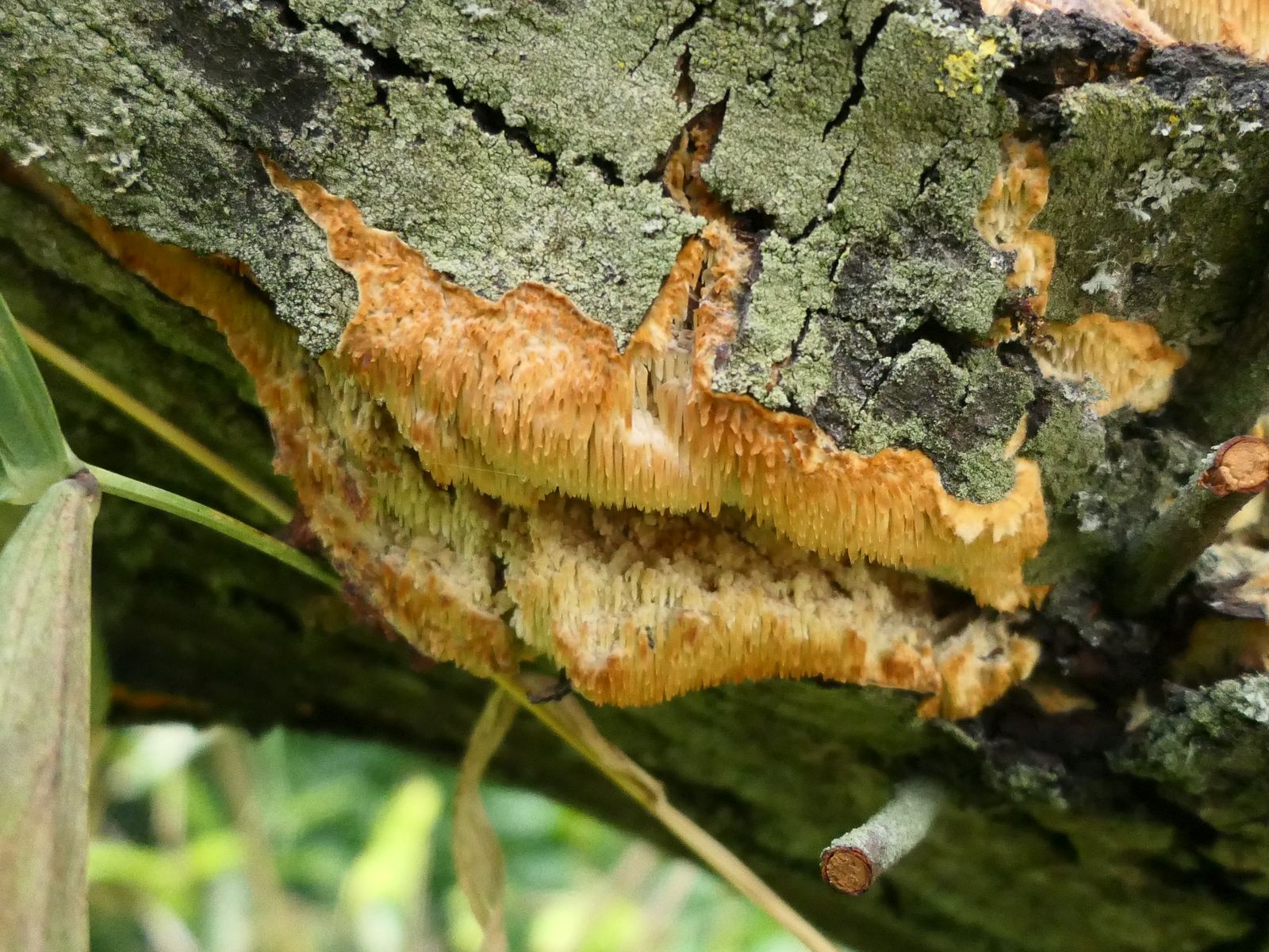 Seit einigen Tagen ist einer der Hauptäste meiner Felsenbirne aufgeplatzt, denn ein gelblicher Stachel-Rindenpilz hat unter der Borke seinen Fruchtkörper ausgebildet.