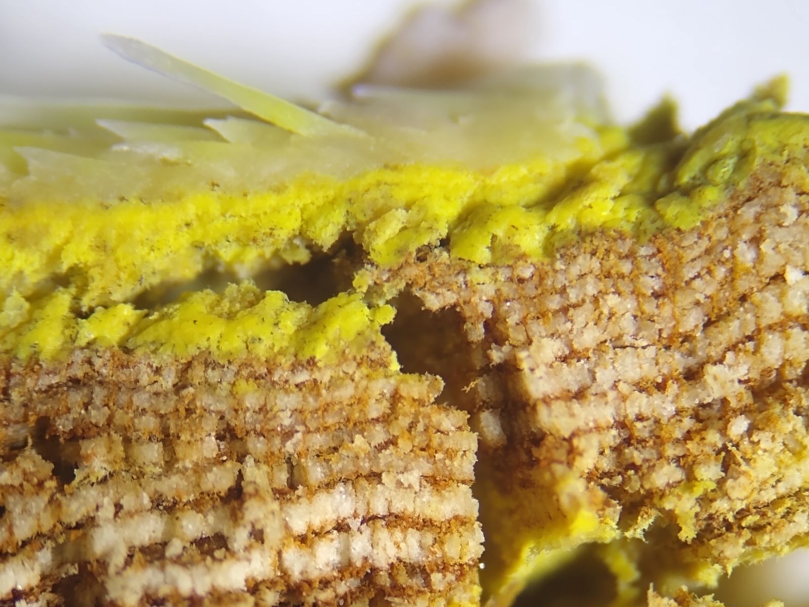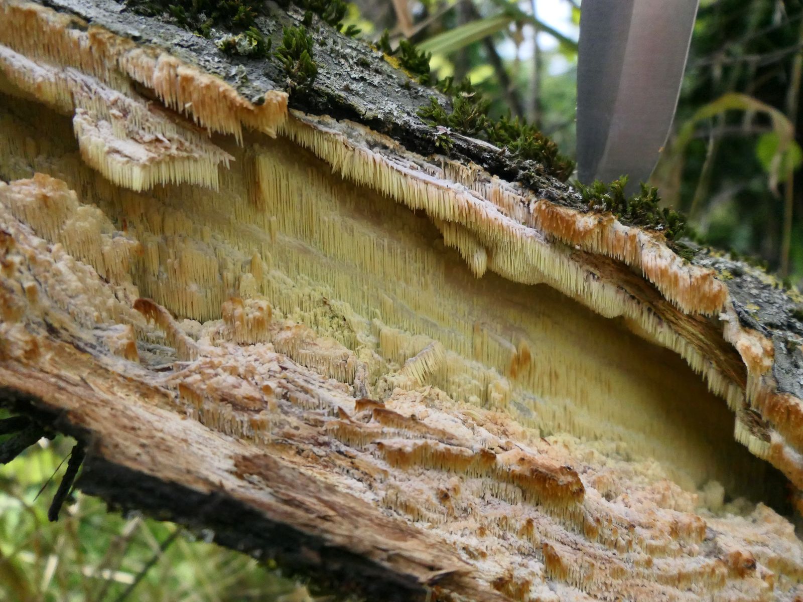 Bild 10 Der Pilz verursacht eine Weißfäule, das Myzel unter der Fruchtschicht (oben im Bild) ist schwefelgelb