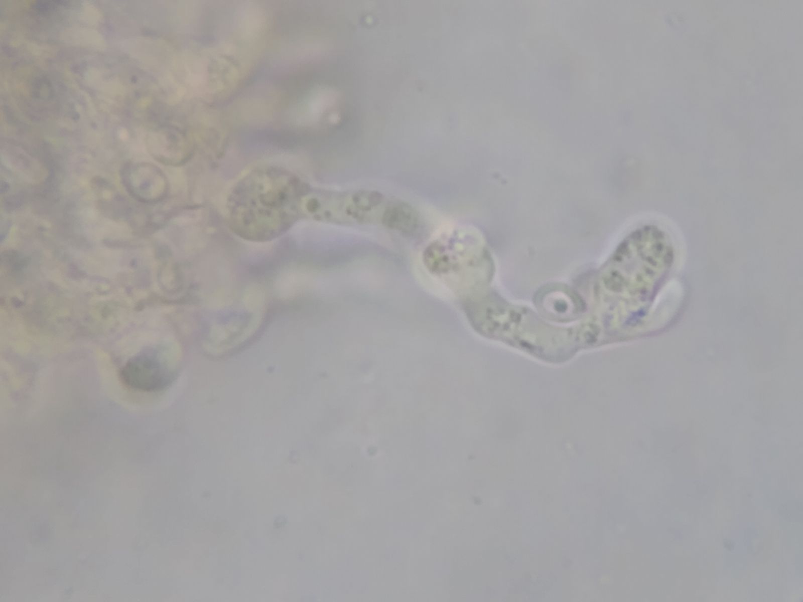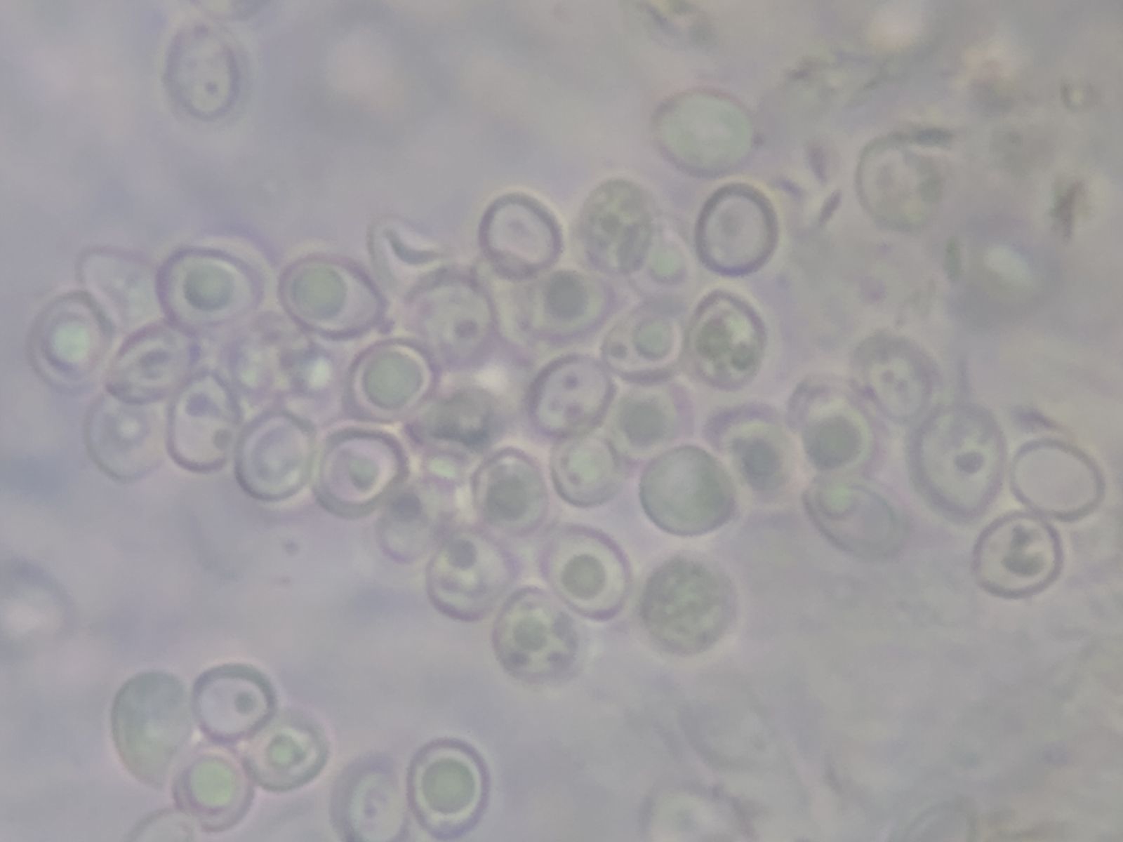 Bild 11 Die Sporen sind sehr breitelliptisch / tropfenförmig und messen um 5 x 4 µm (+/- 0,5µm); Schnallen sind vorhanden (ohne Foto)!