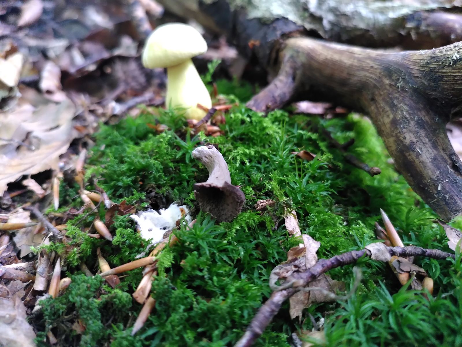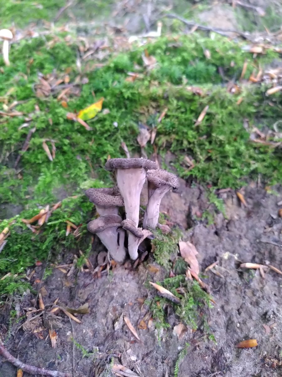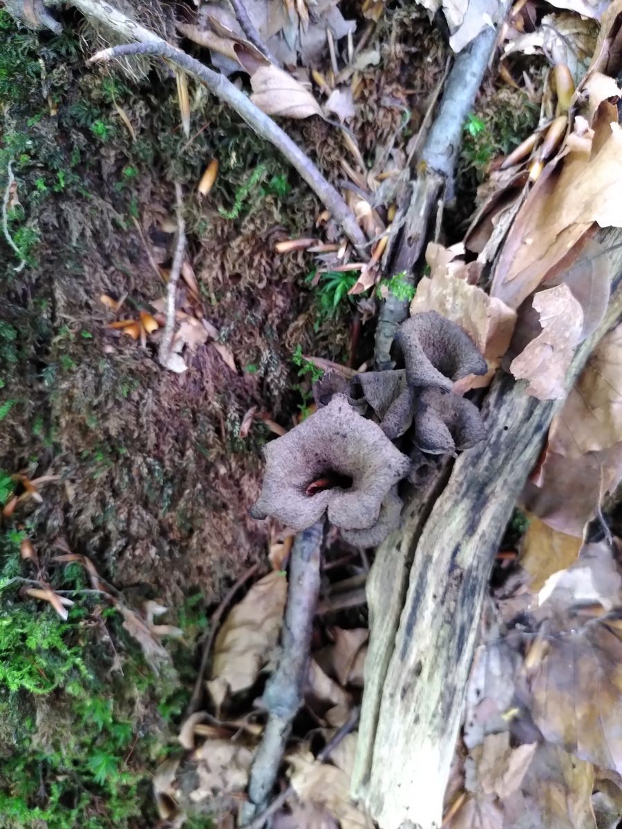 ich habe zum ersten Mal Totentrompeten gefunden, was mich sehr freut. Der Schwefelritterling, der auf einem Bild im Hintergrund zu sehen ist, hat mich zu ihnen geführt, sonst hätte ich sie nie gesehen ^^ Allerdings hing an einem der Büschel noch ein Ascomycet unten dran: Innen glatt und weiß, außen braun und behaart. Der war richtig verbacken mit den Totentrompeten. Ist das Zufall oder parasitiert der auf denen? Kann man so etwas dazu sagen?