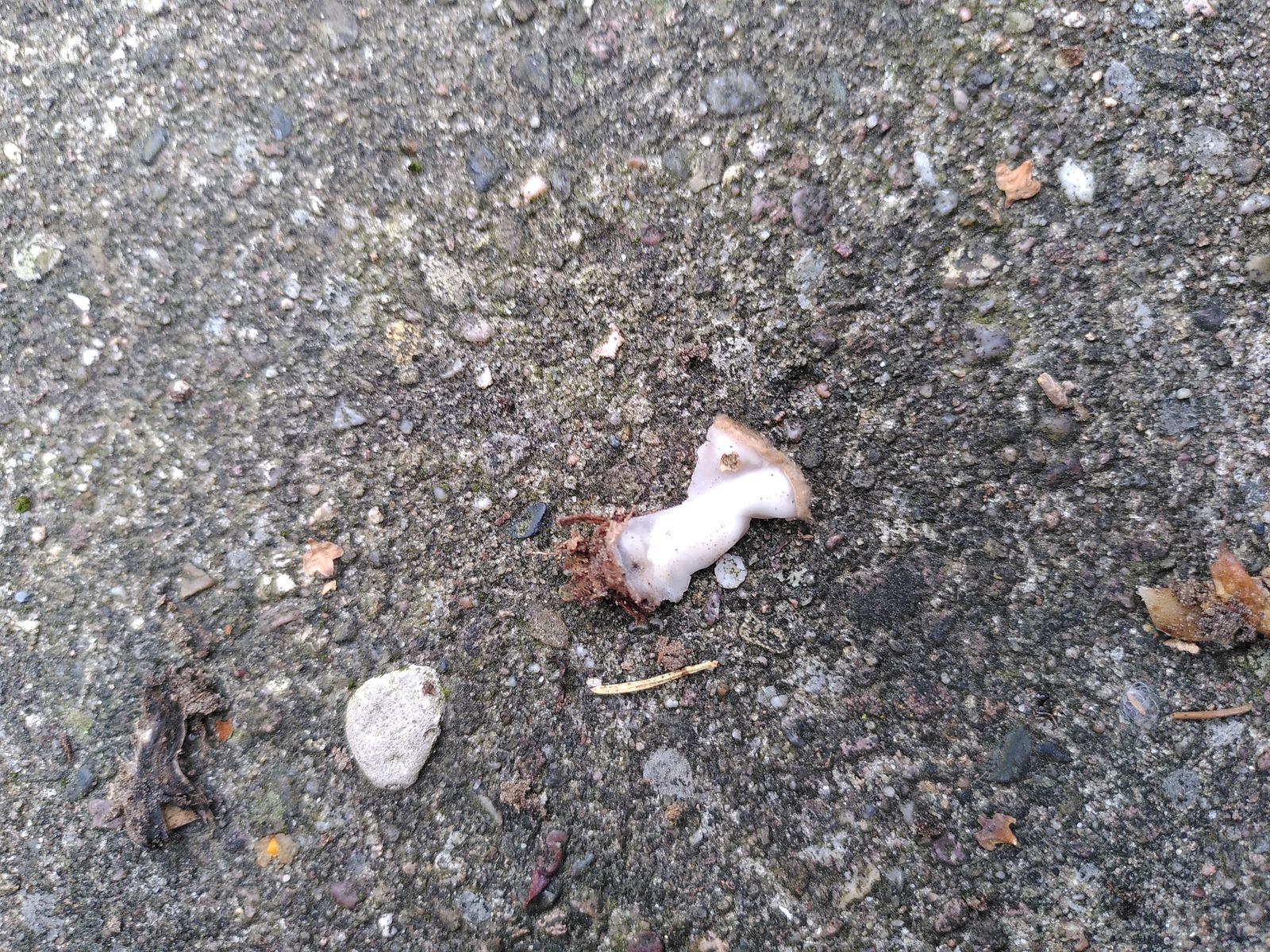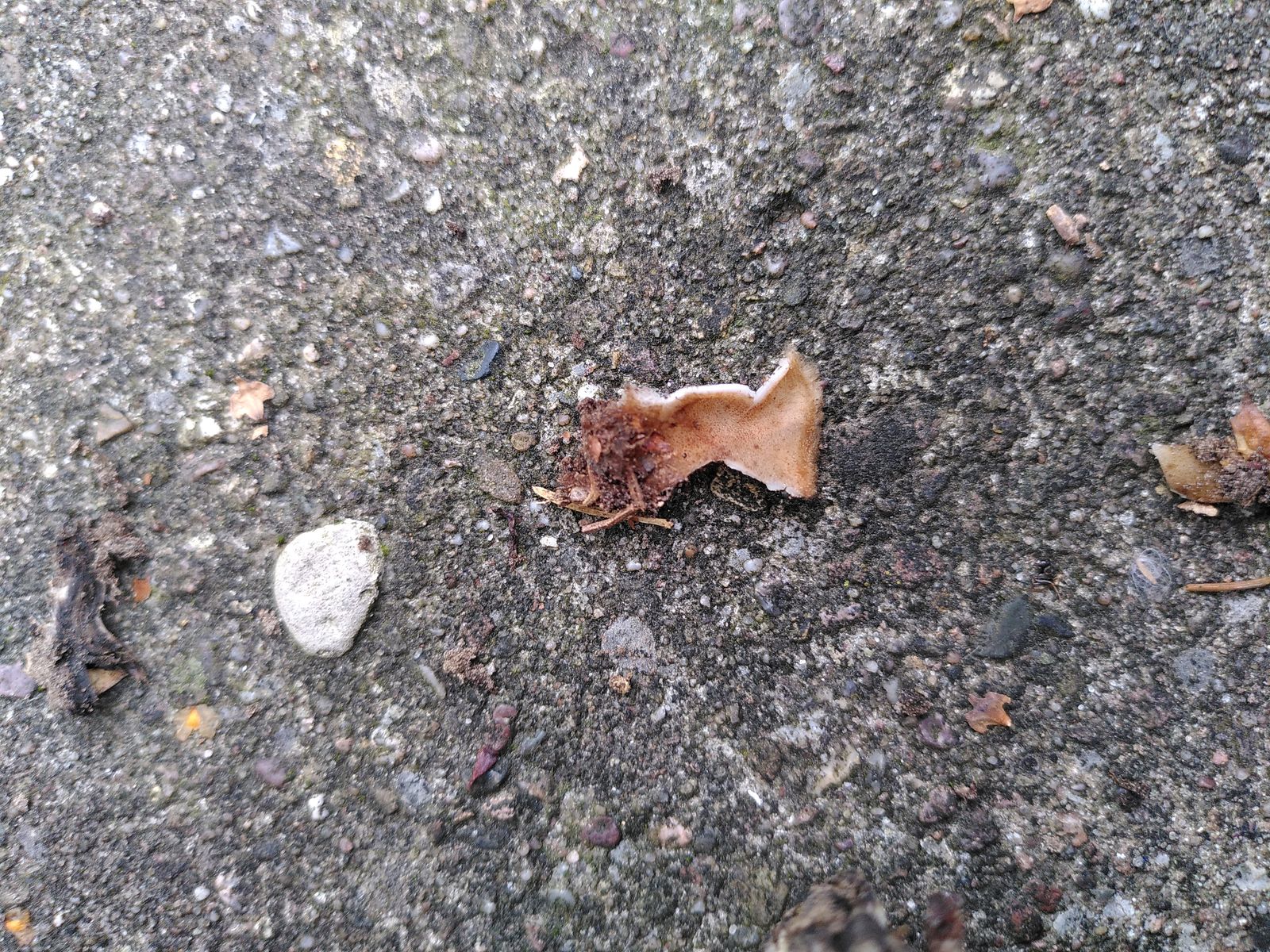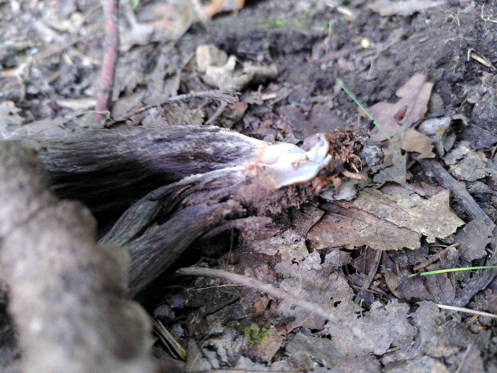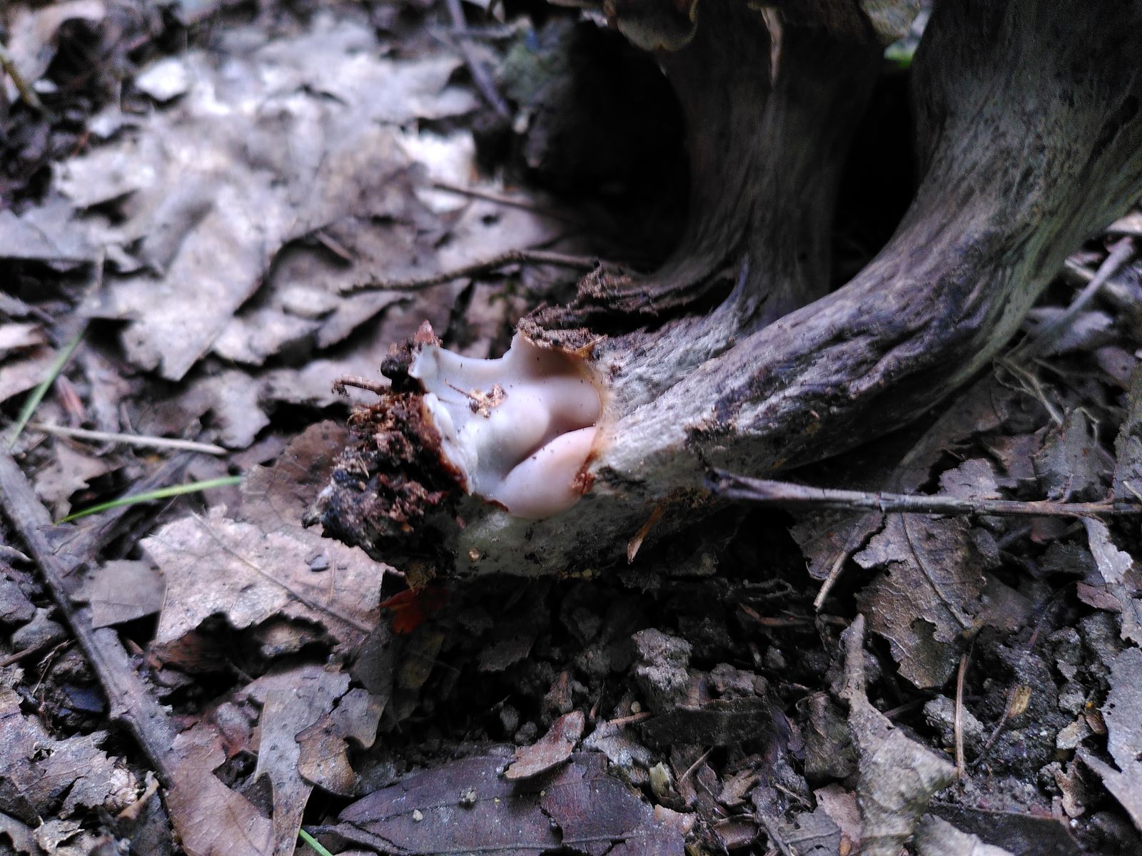 Allerdings hing an einem der Büschel noch ein Ascomycet unten dran: Innen glatt und weiß, außen braun und behaart. Der war richtig verbacken mit den Totentrompeten. Ist das Zufall oder parasitiert der auf denen? Kann man so etwas dazu sagen?