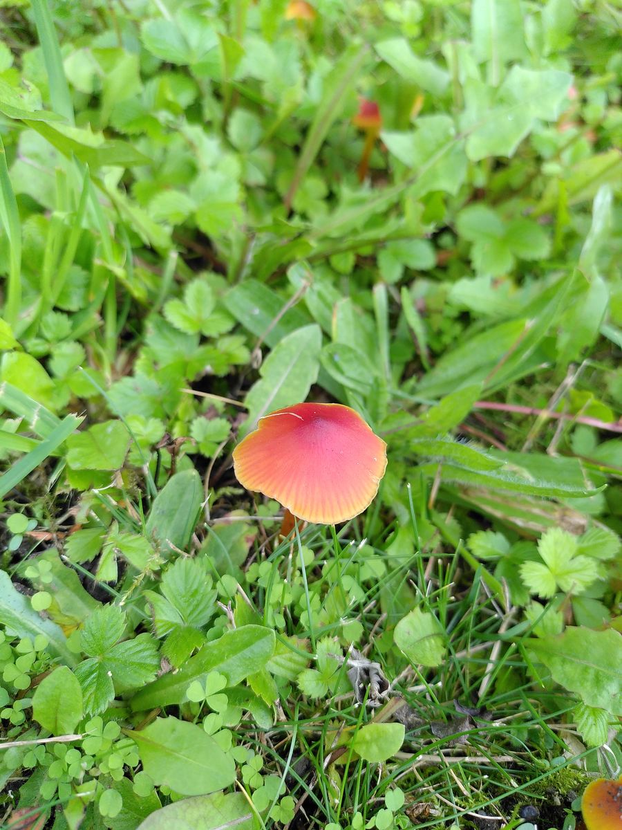 zum ersten Mal habe ich auch einen Saftling gefunden. Da habe ich gar keinen Durchblick, könnte mir hier Hygrocybe conica, den Kegeligen Saftling vorstellen. Bei Verletzung hat er jedenfalls nach einiger Zeit geschwärzt und der Hut ist jung kegelig, glatt und klebrig. ==Gnolm22