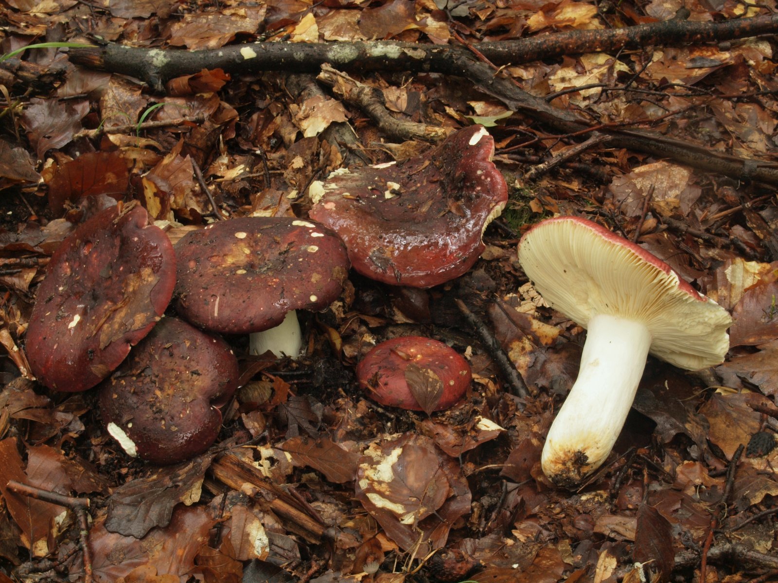 Buche mit einzelnen eingestreuten Eichen auf lehmigem Kalkboden und wärmeexponiert. Man könnte an die sehr farbvariable R. romelli denken, die aber noch dukleres SPP besitzt. Im Feld ist auch R. amarissima ähnlich aber nicht mild sondern extrem bitter. Russula olivacea hatte ich zwar schon mit ähnlicher Hutfarbe ohne oliv, aber die Hutoberfläche sieht völlig anders aus. Zu Hause sah ich schwache Rottöne am Stiel und mit der Phenolreaktion war alles klar. Im Gegesatz zu einigen Beschreibungen in der Literatur können die Frk. leicht 18 cm Durchmesser erreichen.