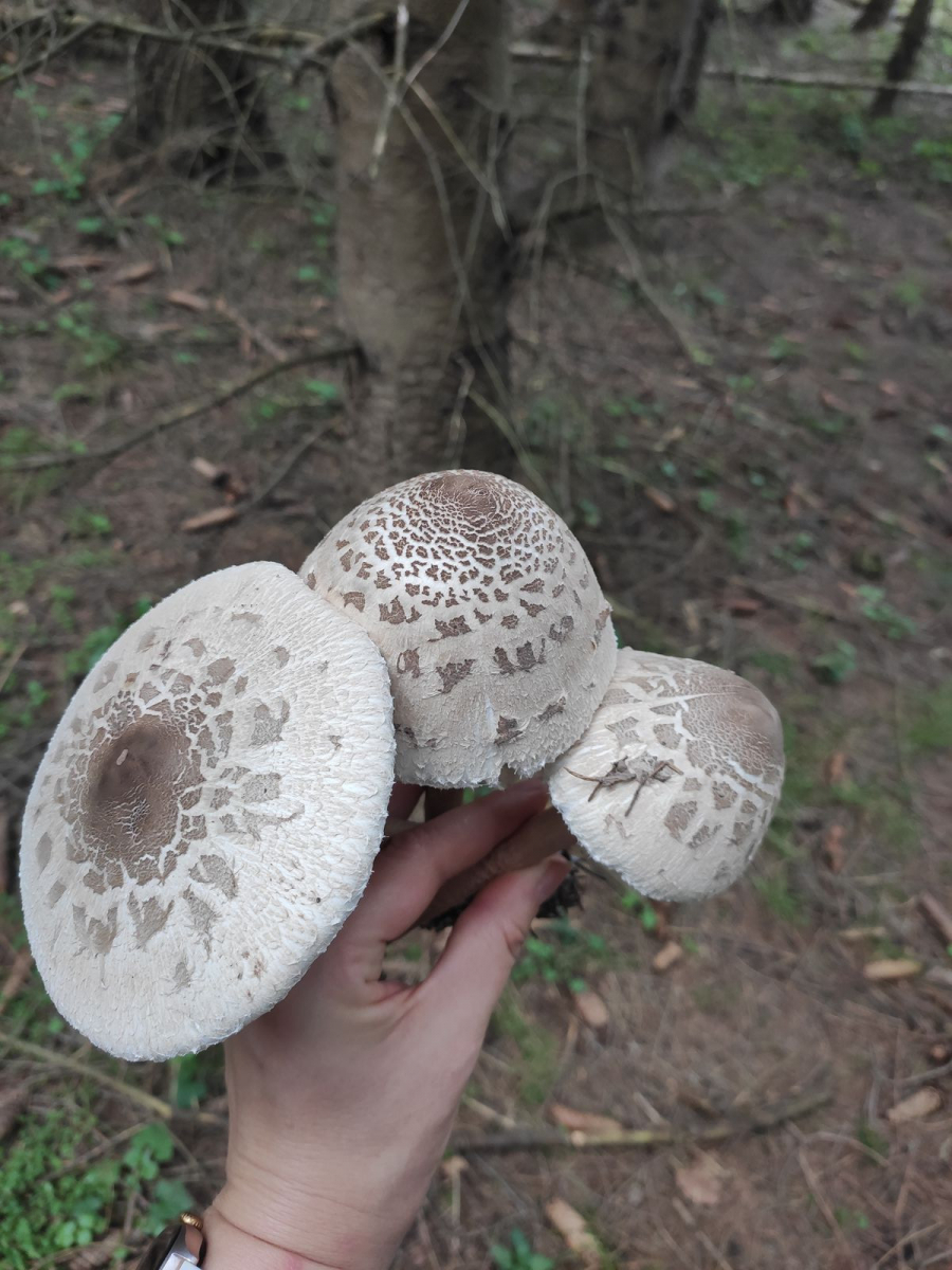 • Auf dem letzten Bild kann ich zwar auch keine Natterung erkennen. Ich halte die drei Pilze aufgrund dem sehr ähnlichen Erscheinungsbild des Huts dennoch für die selbe Art, müsste demnach auch ein Riesenschirmling (Macrolepiota) sein. Meiner Einschätzung sollte das auch was aus dem Parasol-Aggregat sein.