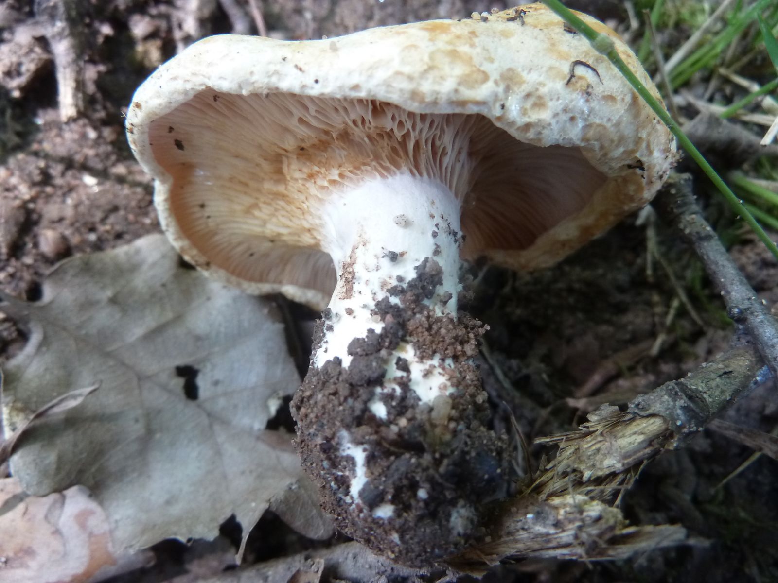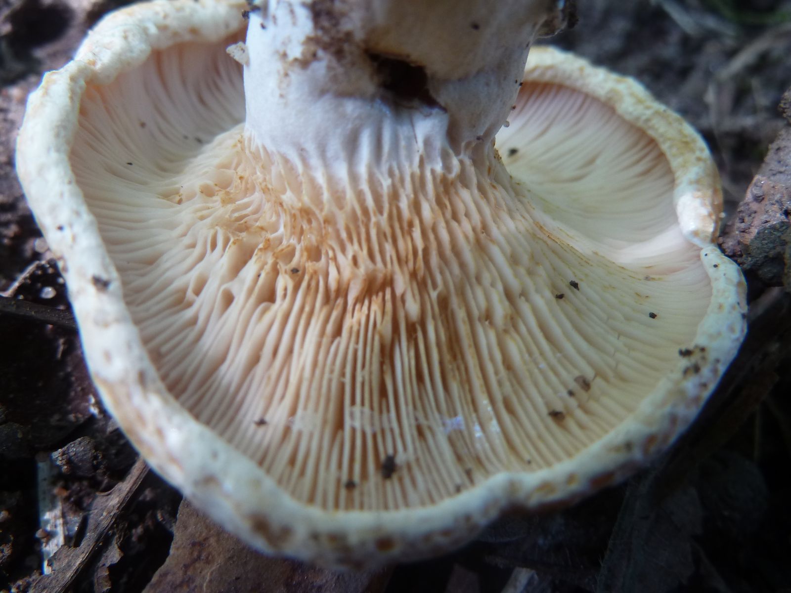 Der Hut ist eher konzentrisch gefleckt als gezont, der Hutrand kahl, das anhand der Lamellenfarbe abzuschätzende Sporenpulver ziemlich dunkel ockerfarben und die Lamellen stark anastomisierend. Außerdem scheint der Stiel nicht ganz zentral zu sitzen.