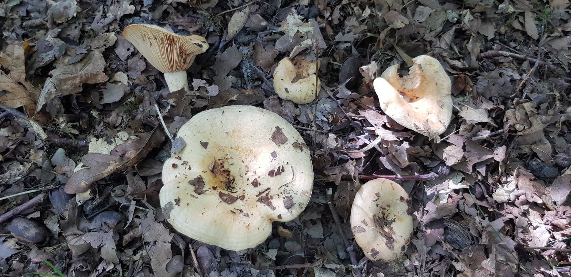 Heute unter alten Eichen und Buchen auf basischem Boden in der Nähe von Beton und Basaltschotter gefunden. Milcht nur spärlich, Geschmack nach kurzer Zeit ordentlich scharf. Wegen der in Stielnähe deutlich queraderigen Lamellen lande ich bei L. acerrimus. Aber da gibt es ja noch ein paar Doppelgänger. Wegen dem deutlich gezonten Hut wäre L. zonarius auch noch eine Option.