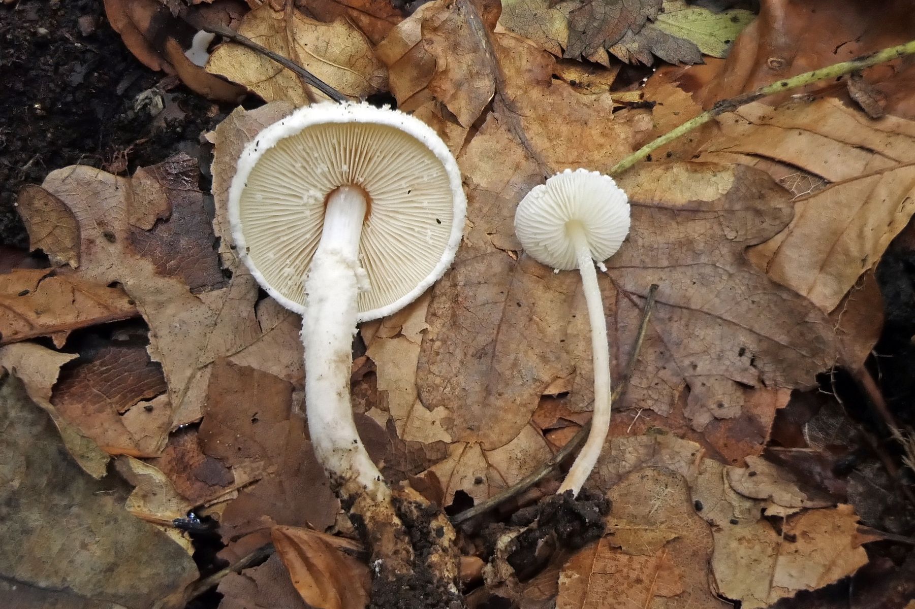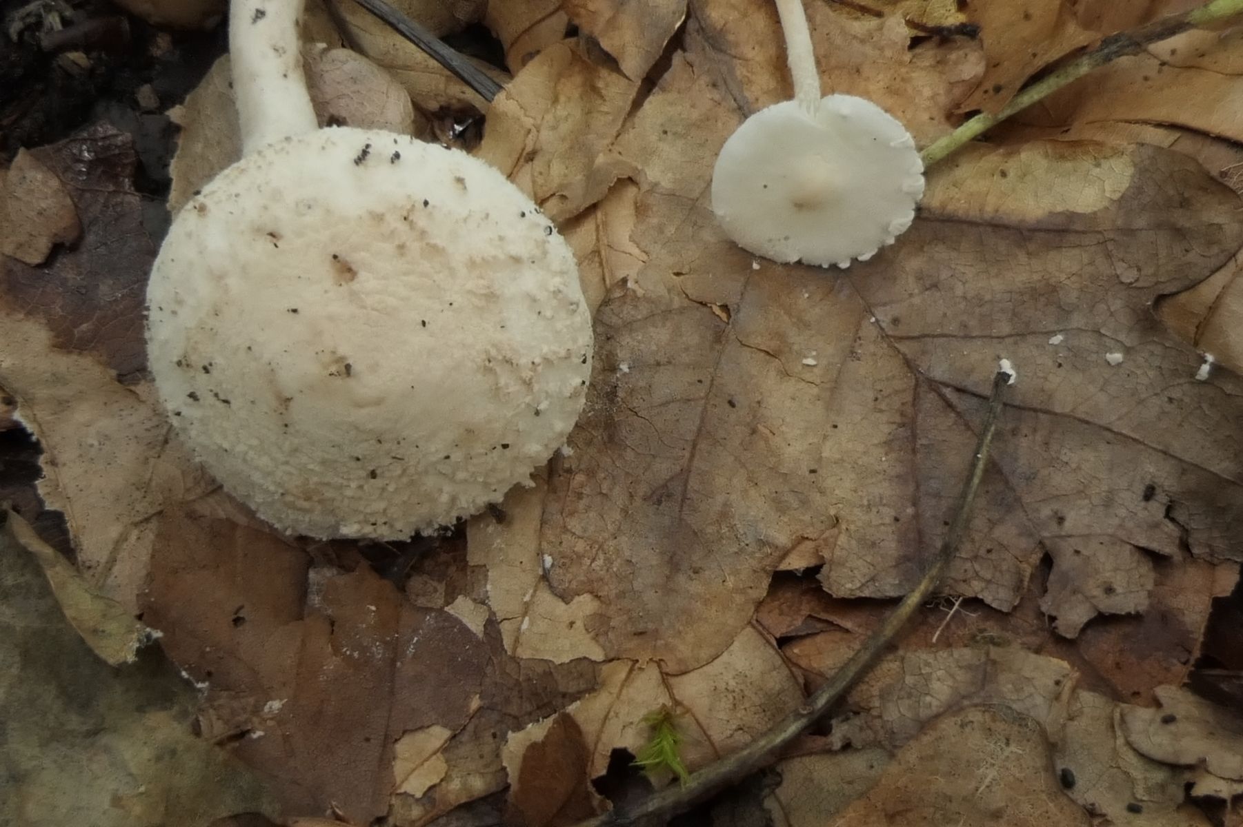 Hier könnte 03 Cystolepiota (seminuda) und/oder ggf. Leucocoprinus in Betracht kommen. Leider konnte ich diese nicht zum Mikroskopieren mitnehmen. Diese zwei Fruchtkörper mal zum Vergleich, sie wuchsen interessanterweise in räumlicher Nähe zueinander.