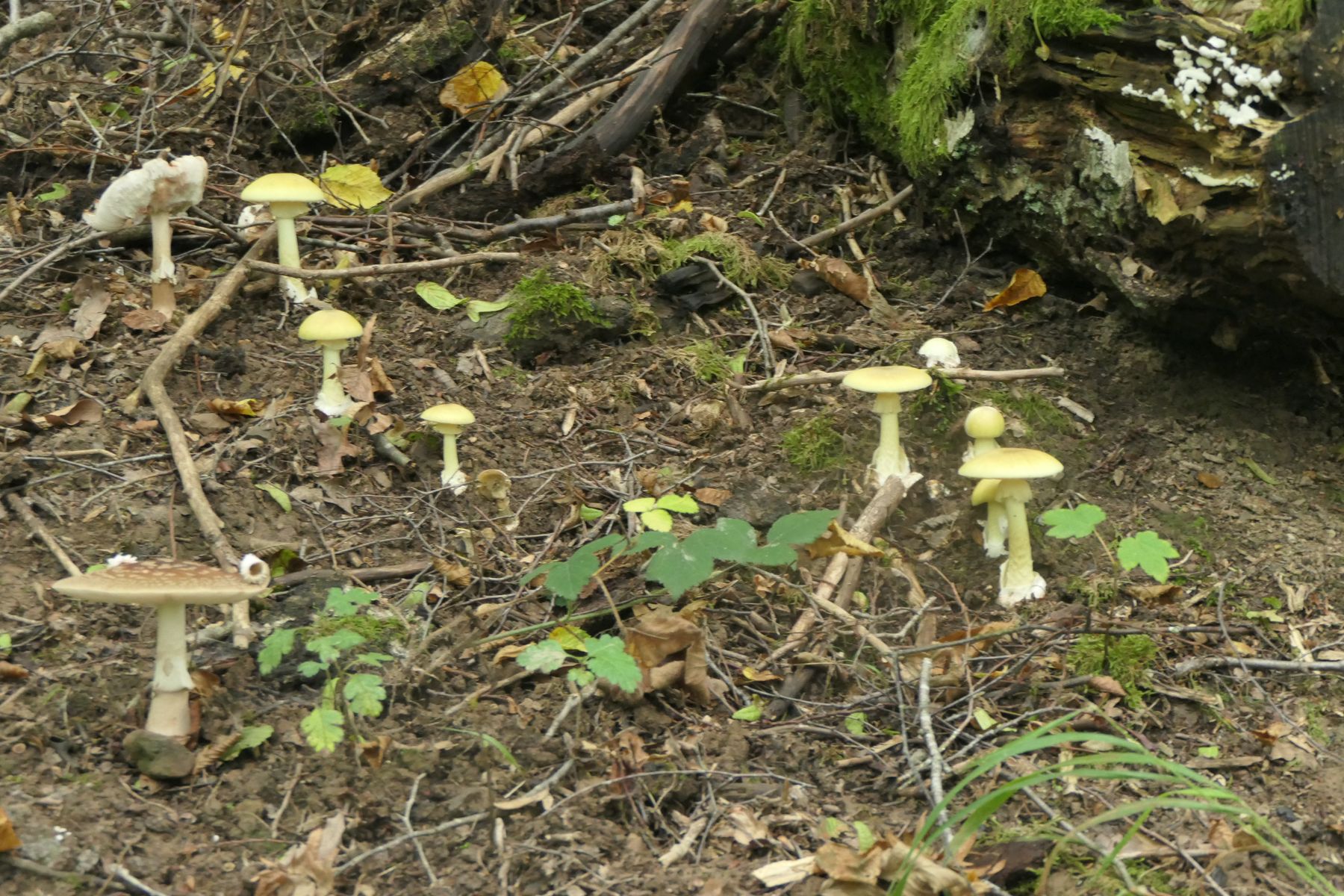 Und diese schöne Gruppe 12 Knollenblätterpilze am Wegrand musste auch noch eingefangen werden (leider etwas verwischt):