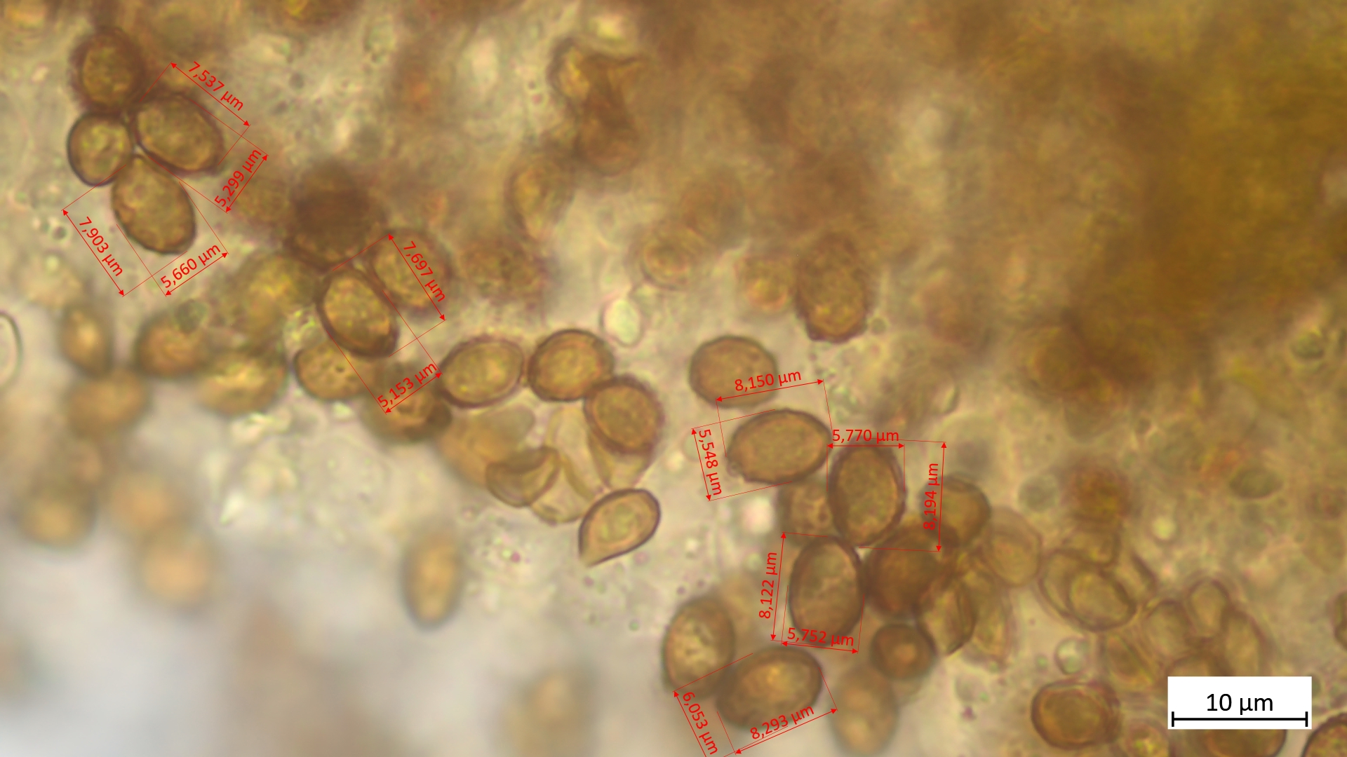 7,5-8,3 µm (av. 8,0 µm, SD 0,3 µm) x 5,2-6,1 µm (av. 5,6 µm, SD 0,3 µm); Q = 1,4-1,5 (av. 1,4, SD 0,0)(n = 7)