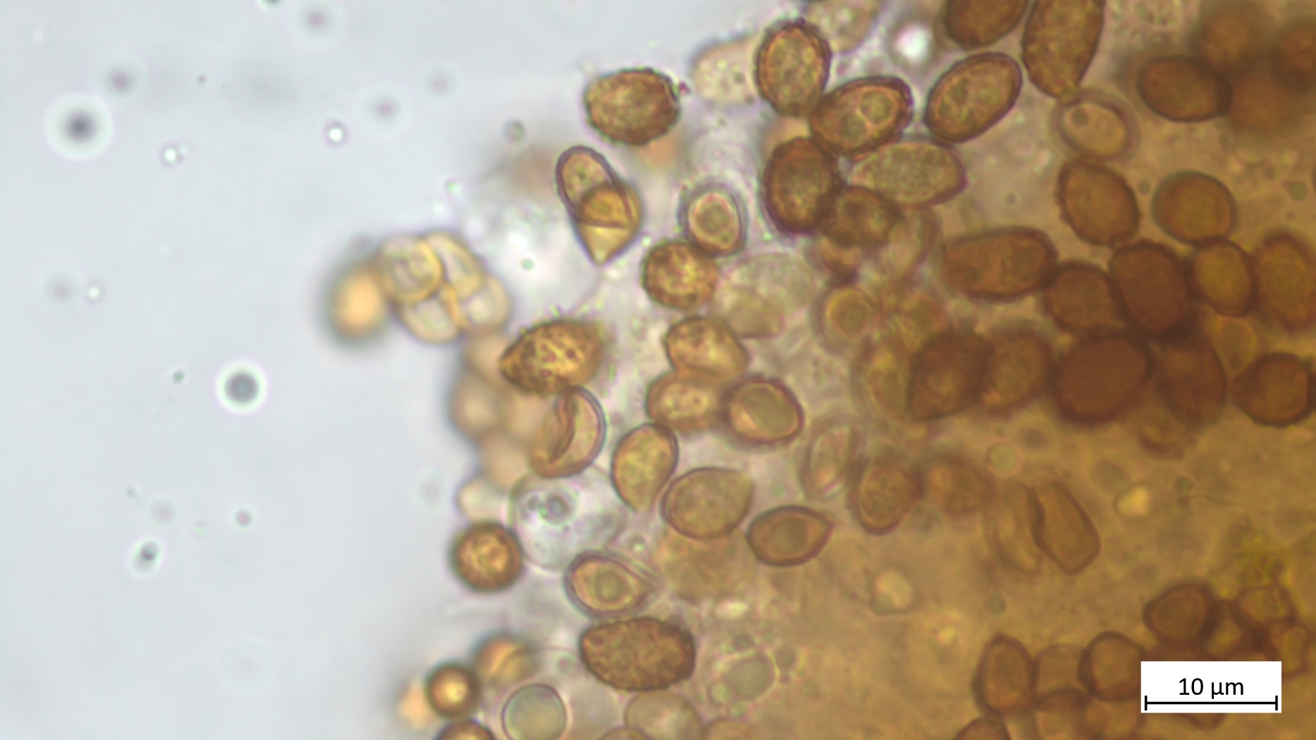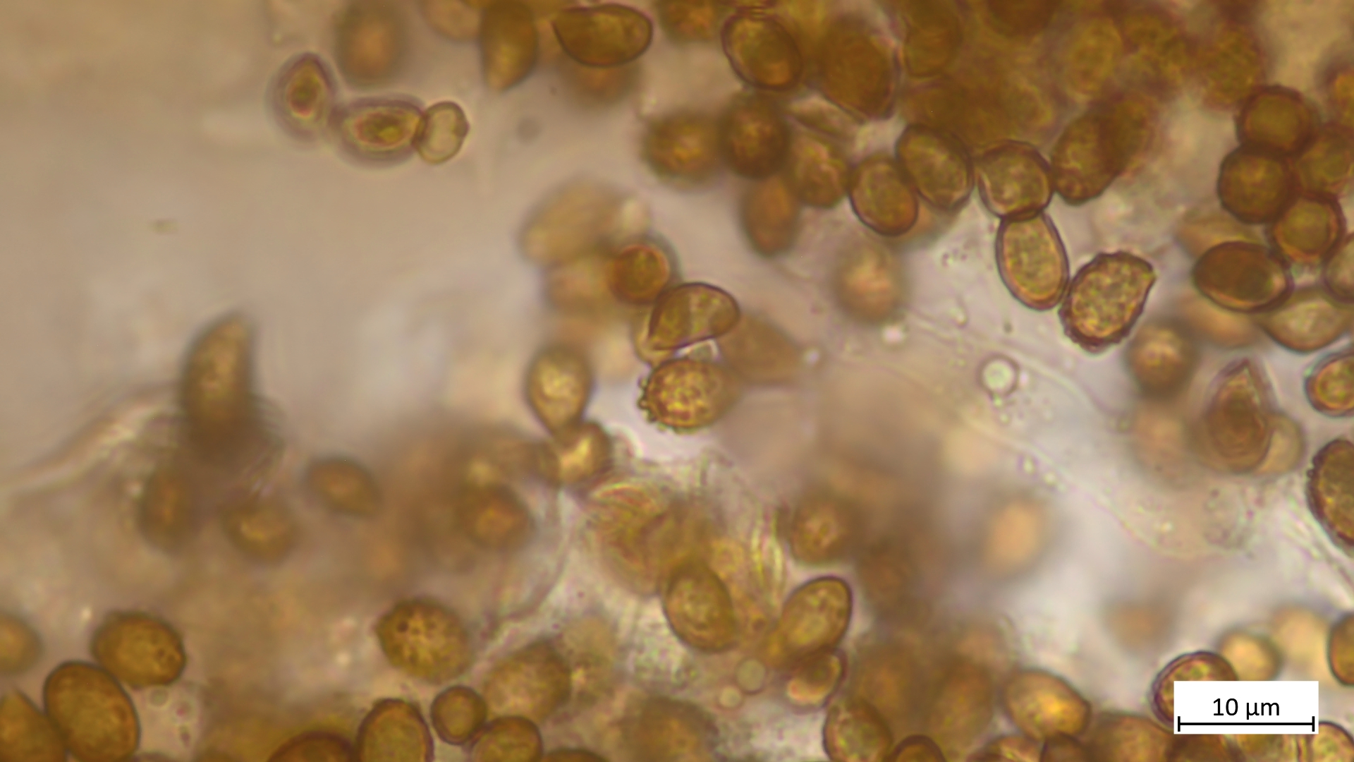 Konnte 04 Cortinarius saniosus sein? Bei dem gelben Velum habe ich jetzt einfach mal mit Telamonien in Flandern geschlüsselt. Die Sporen passen sehr gut, ausgeprägtes Ornament und von der Größe: