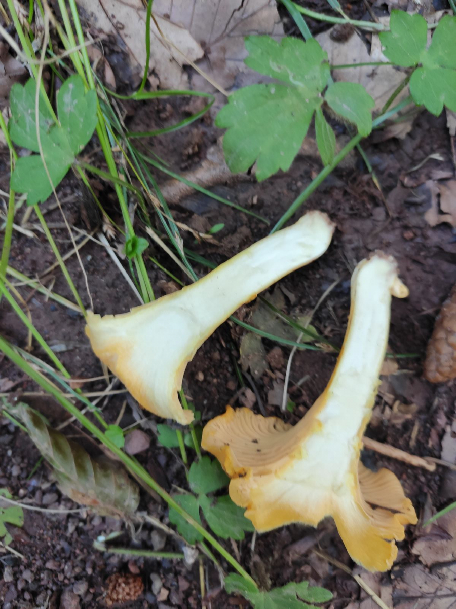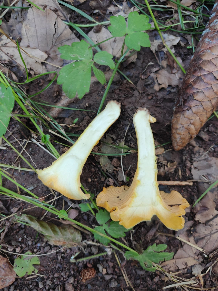 nachdem mir hier vor kurzen schon einmal hervorragend weitergeholfen wurde, geht meine Erkundung im Bereich der Pfifferlinge in die nächste Runde. Der heutige Fundort war ein sehr feuchter Talgrund mit Laubwald. Direkt am Wegesrand habe ich die "Verdächtigen" entdeckt. Der Querschnitt zeigt weißes Fleisch ohne Hohlkörper. Die Größe der Pilze hat von ca. 1 cm bis ca 7 cm. Ist das nicht deutlich zu groß für einen Pfifferling?! Der Geruch ist dezent pilzig.Auch hier gilt, ich möchte keine Verzehrgenehmigung sondern eine Identifizierung. 😉