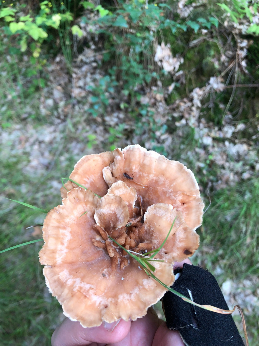 Hier stehe ich völlig auf dem Schlauch, würde ihn den stachlingen zuordnen , aber ehrlich gesagt habe ich keine Ahnung, wo ich anfangen soll zu zuordnen. Standort war direkt auf dem Waldweg, hauptsächlich buchenwald (teilw. Kiefern) sonnig. Die weiße Oberfläche unter dem Hut kann gut Schimmel sein. Hat jemand ne Richtung?