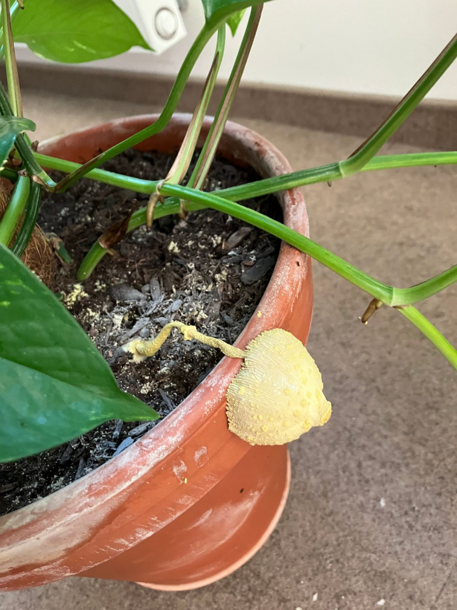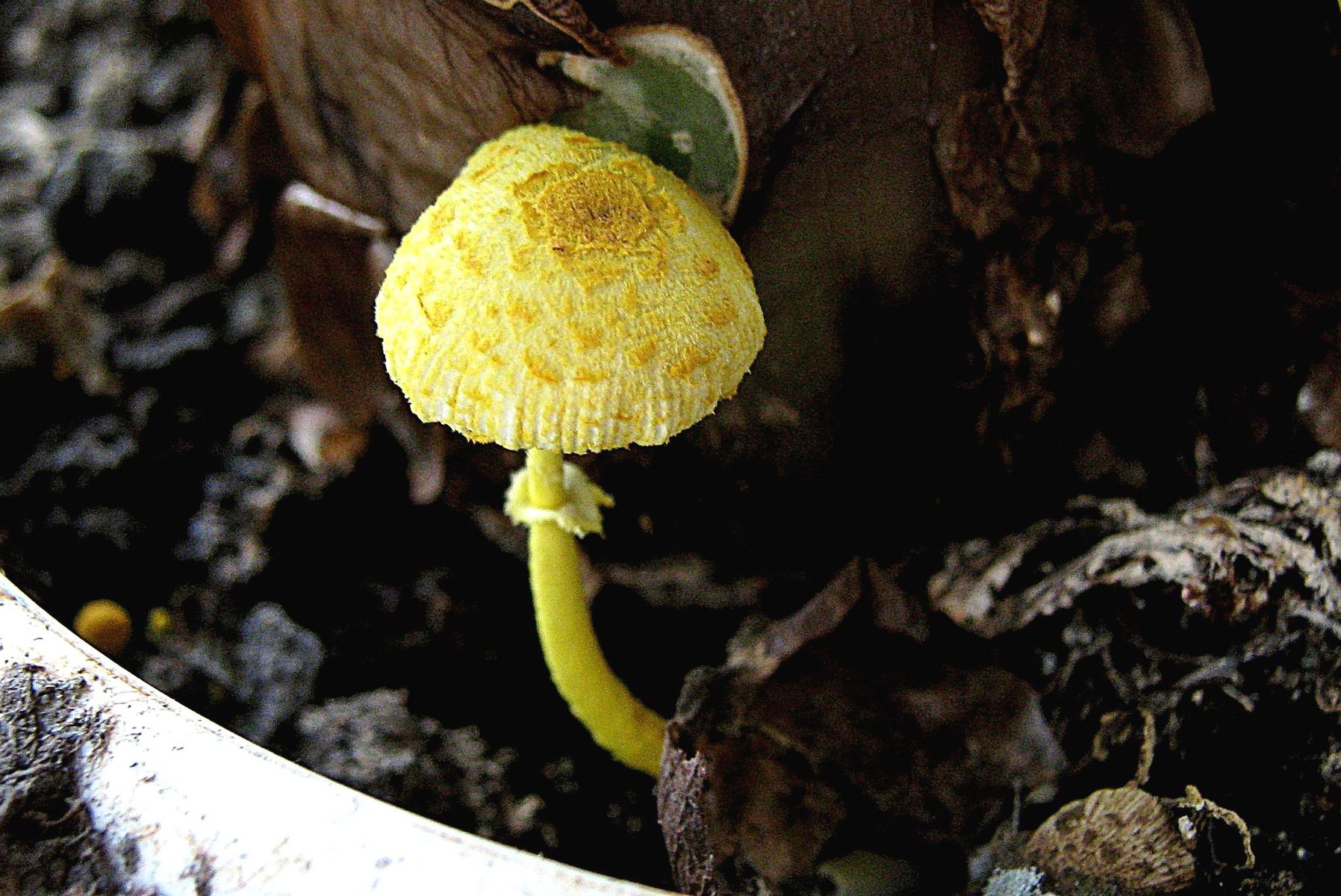 Den Gelben Faltenschirmling durfte ich vor 13 Jahren ebenfalls im Blumentopf begrüßen.