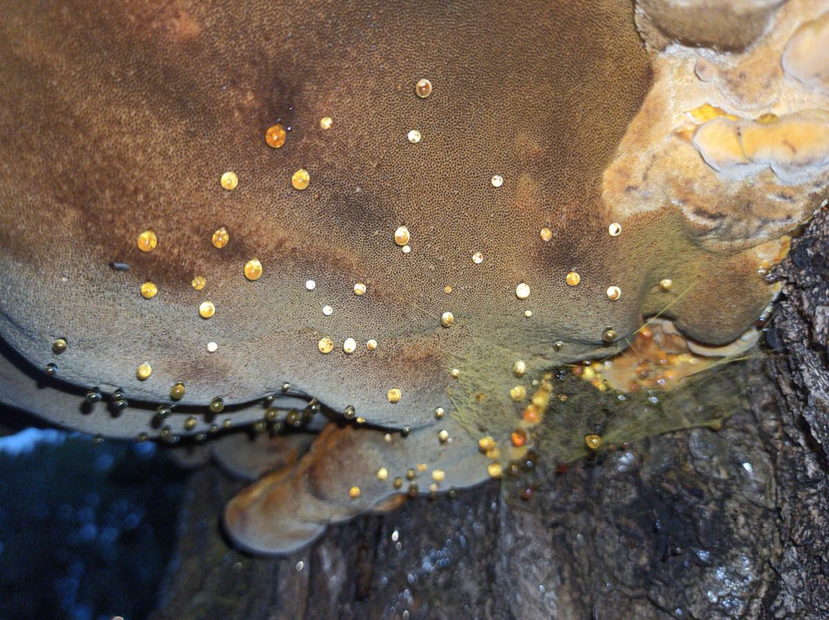 In einer Allee fielen mir an einer großen Esche diese weichen, übereinander wachsenden Porlinge auf. Der Durchmesser der Fruchtkörper war so um die 20cm. Der Geruch war etwas muffig/säuerlich, ähnlich dem Schwefelporling, aber nicht sehr charakteristisch. Die recht feinen Poren verfärben sich dunkel auf Druck. Die Oberseite war zottig/filzig. Die Fruchtkörper waren ziemlich weich, ähnlich einem frischen Schwefelporling. Auf der Unterseite sammeln sich an den Poren einige gelbbraune Tröpfchen.