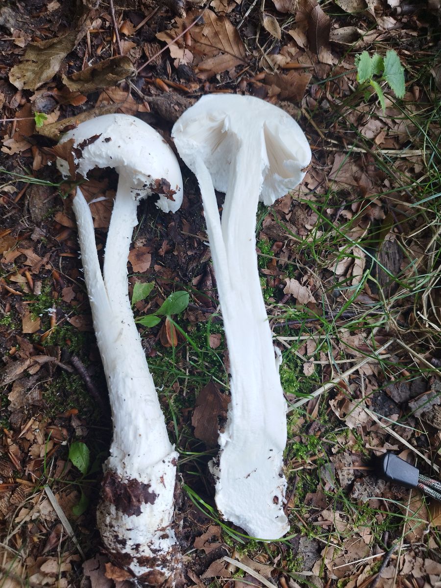 Ca. 20 cm Hoch. Farbe weiß, bei Druckstellen und Schnittstellen leicht gelb verfärbend. Der Stiel ist Fransig , zur Basis bis hin dicker werdend mit einer gut sichtbaren Knolle. Diese ist an einigen Stellen gelb verfärbt.