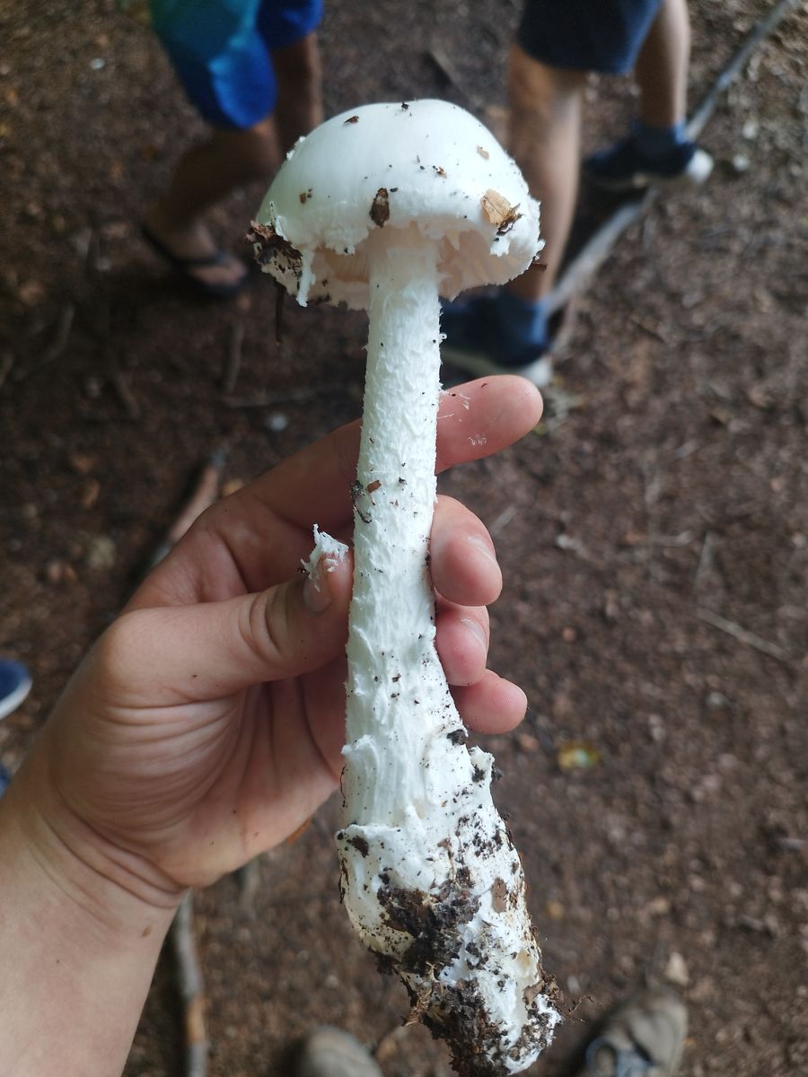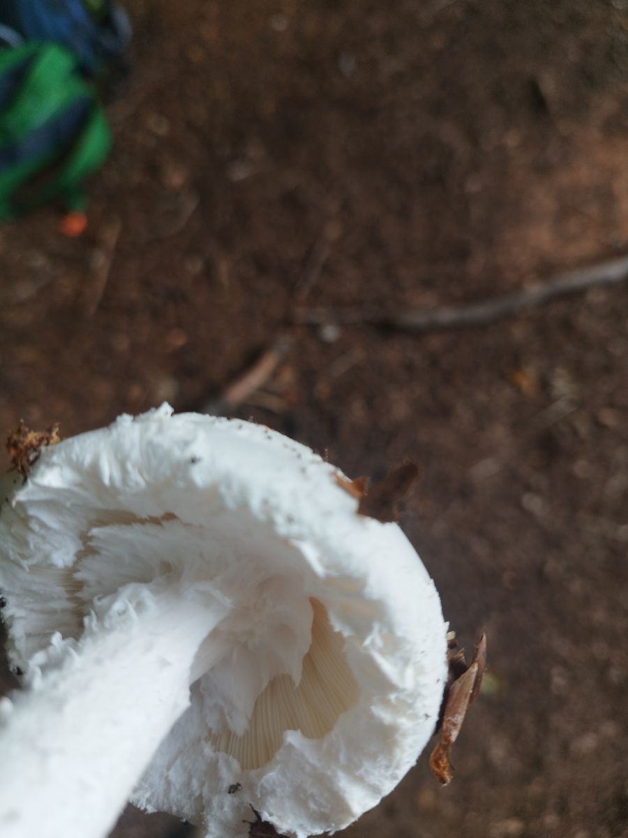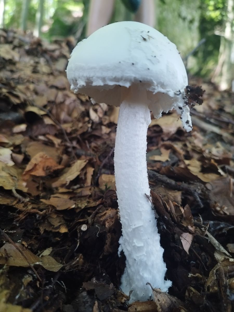 Hut ca. 5 cm breit, Halbkugelig. Velumreste auf dem Hut, am Hutrand und am Stiel. Diese zergehen zwischen den Fingern fast wie Schaum.