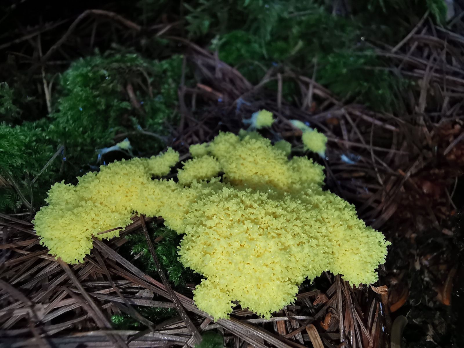 Besten Dank für eure Vorschläge. Austernseitling Da hast du recht, mir kam das auch ziemlich grobkörnig vor und ich habe mir den Gelben Eierschleimpilz auch mal angeschaut, optisch würde das schon etwa hinkommen, aber ich kenne mich da einfach zu schlecht aus. Vielleicht meldet sich ja noch ein Schleimpilzexperte, aber vielleicht geht da wirklich nur etwas, wenn man es mikroskopisch untersucht. :)