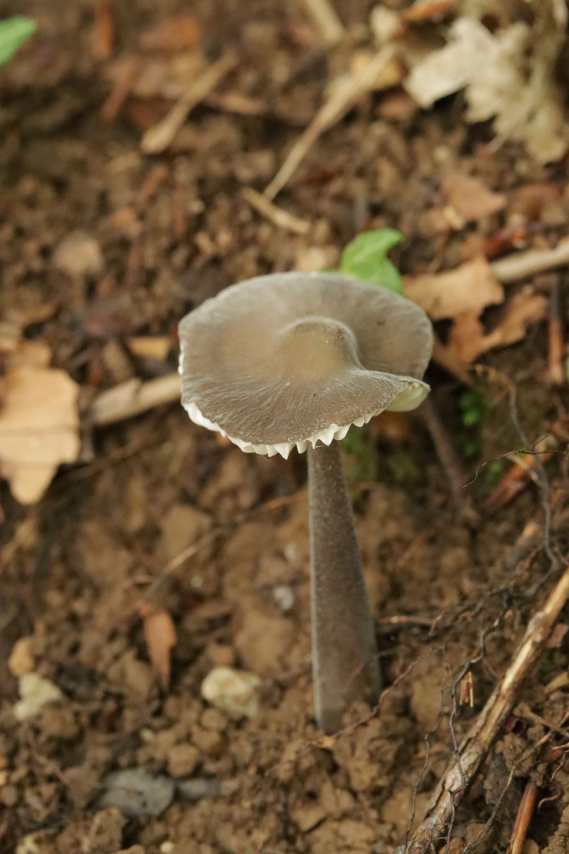 Der Pilz wuchs mitten auf einem Weg, umgeben von Buchen und Fichten.