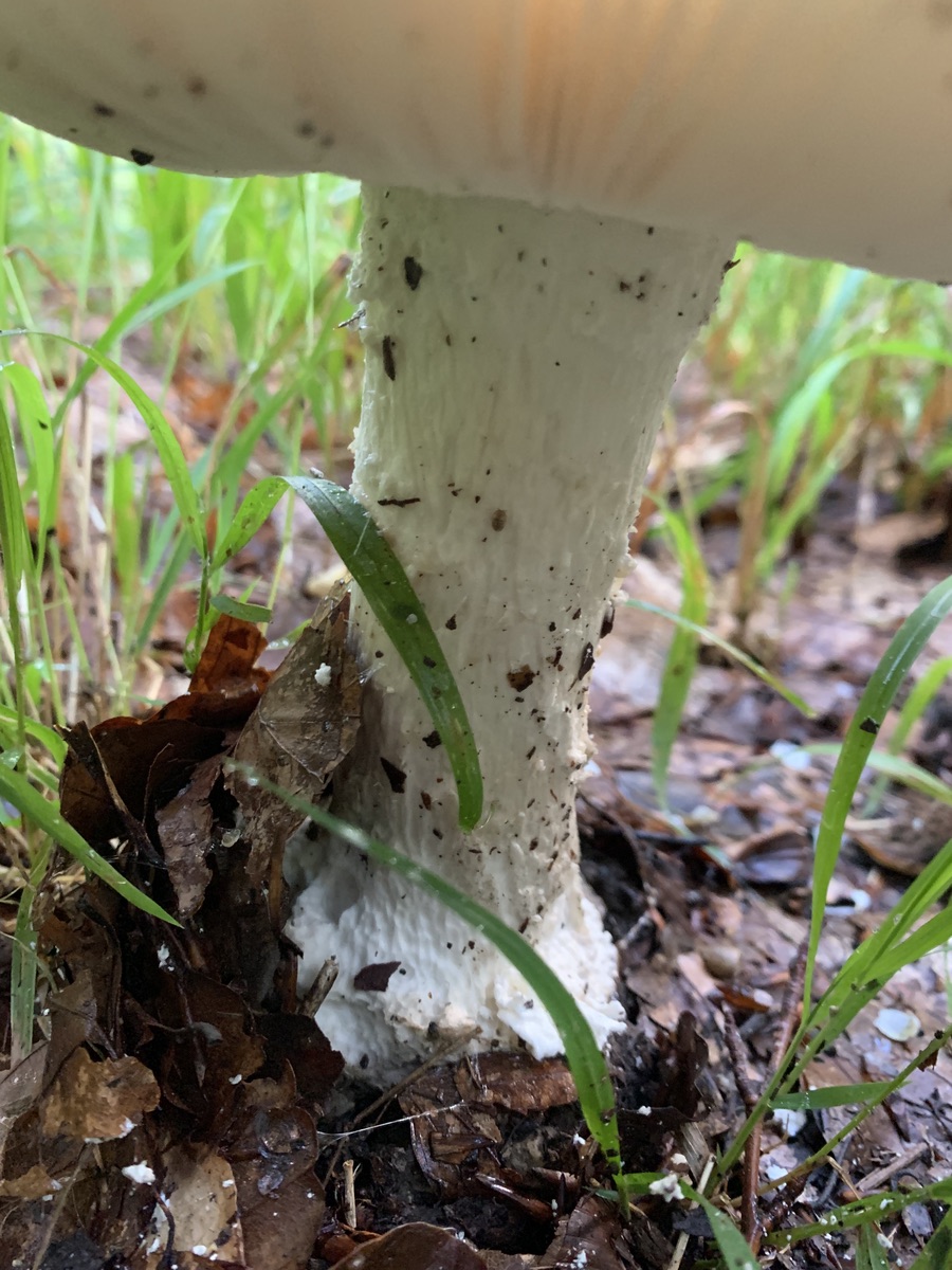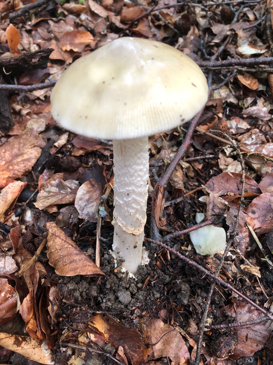 Der zweite Amanita gehört nicht zu den Scheidenstreiflingen und war nochmals ein Stück größer (der Hut war größer als meine ausgebreitete Hand und hatte zudem einen bestimmt 20 Zentimeter langen Stiel und stand auf einem Weg, der sich an einem Westhang langgeschlängelt hat (auf ca. halber Hanghöhe).