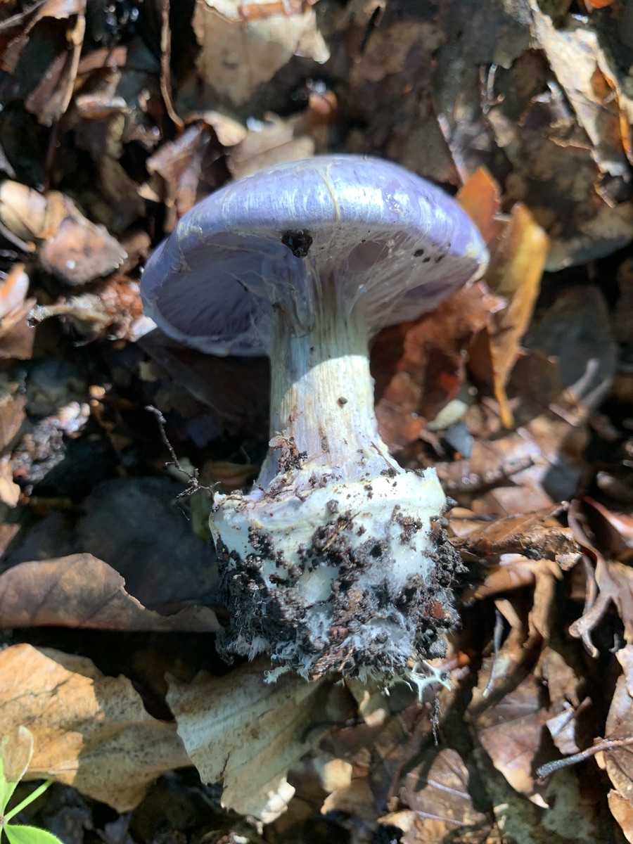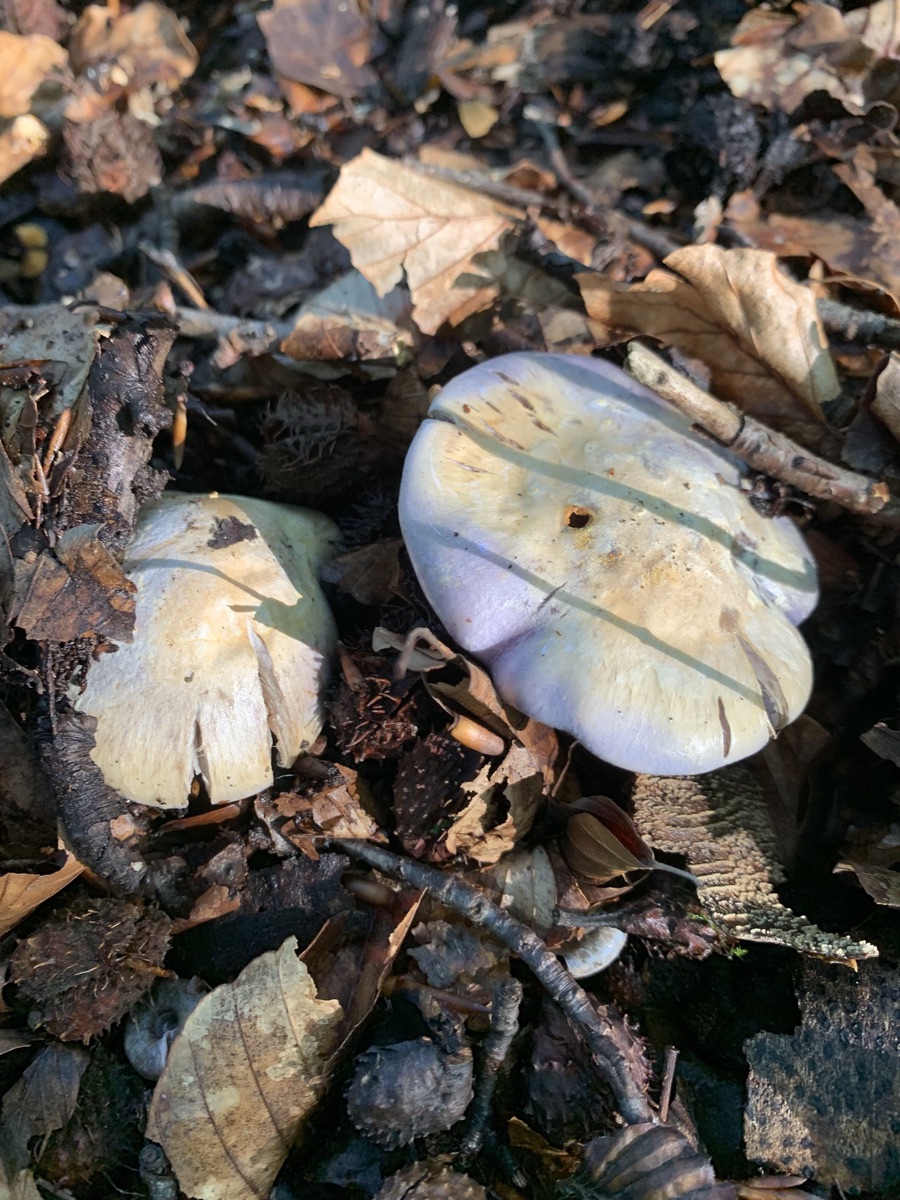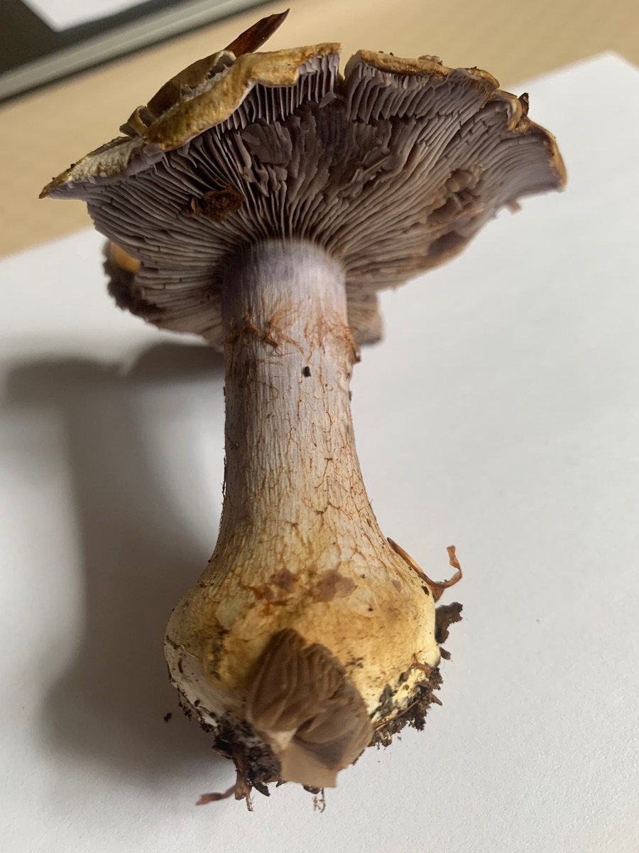 Der erste Fund wuchs an einer moosigen Stelle in unmittelbarer Nähe zum Wurzelnden Bitterröhrling. Hier waren zudem R.olivacea, L.acerrimus und weitere Cortinarien auf kleinem Raum zu finden. Auffällig waren die lila Farbtöne sowie der blasse Hut.