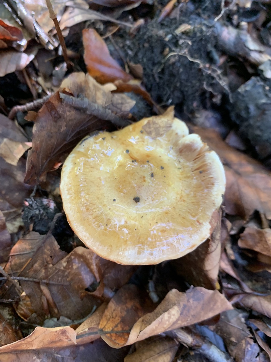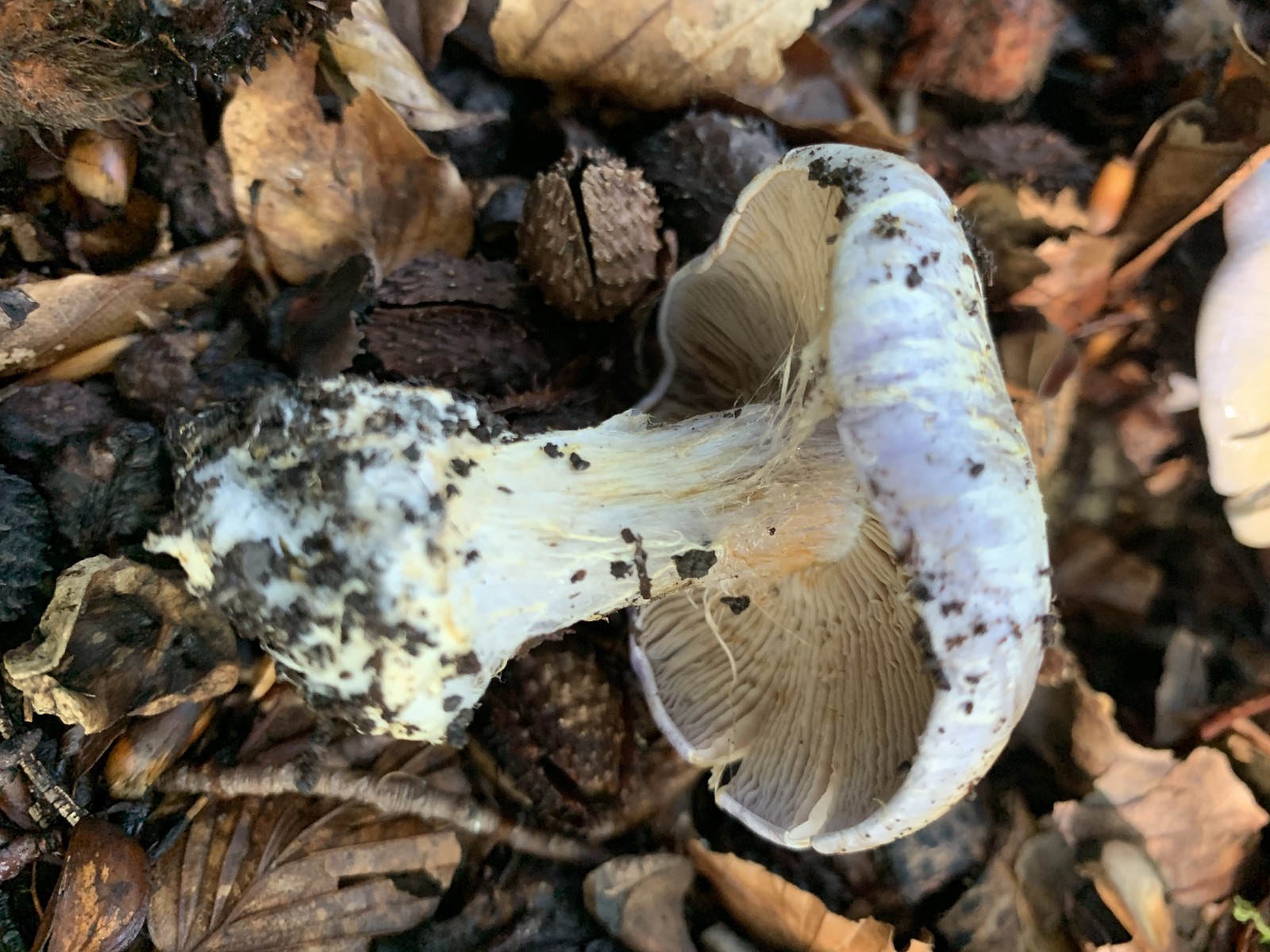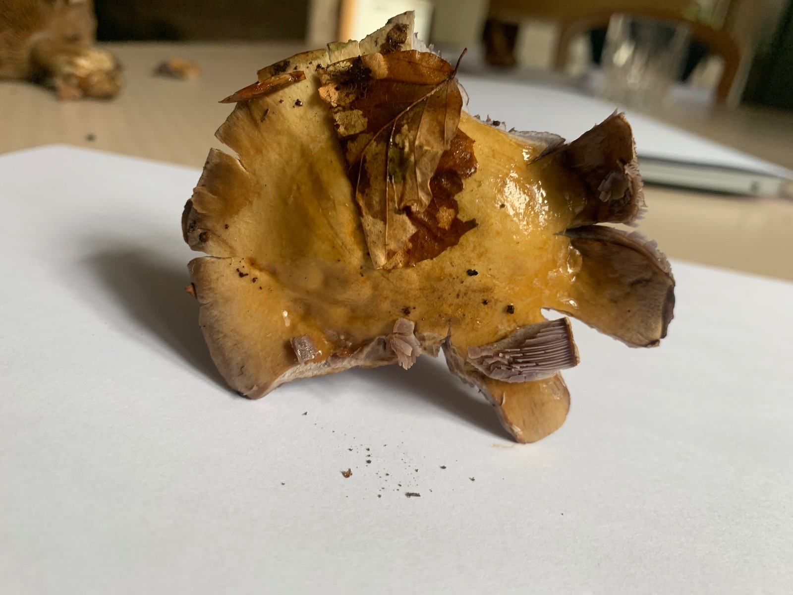 Den nachfolgenden Schleierling habe ich mit nach Hause genommen, weshalb ein Schnittbild vorliegt. Mit meiner aktuellen Literatur und ohne Chemikalien kam ich bei der Bestimmung leider nicht weiter. Man beachte die am Hut klebenden Blätter. Es dürfte sich also um einen Schleimkopf handeln.